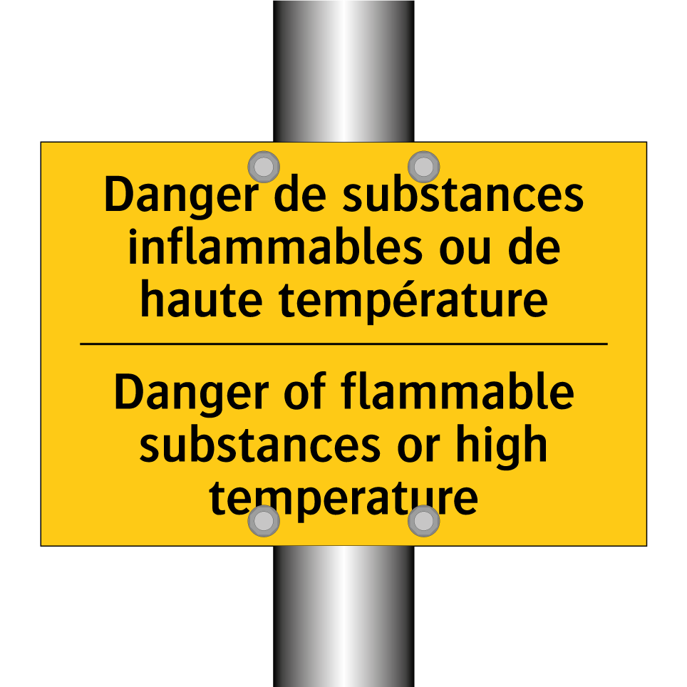 Panneau d'avertissement bilingue avec texte en français : "Danger de substances inflammables ou de haute température", et en anglais : "Danger of flammable substances or high temperature"