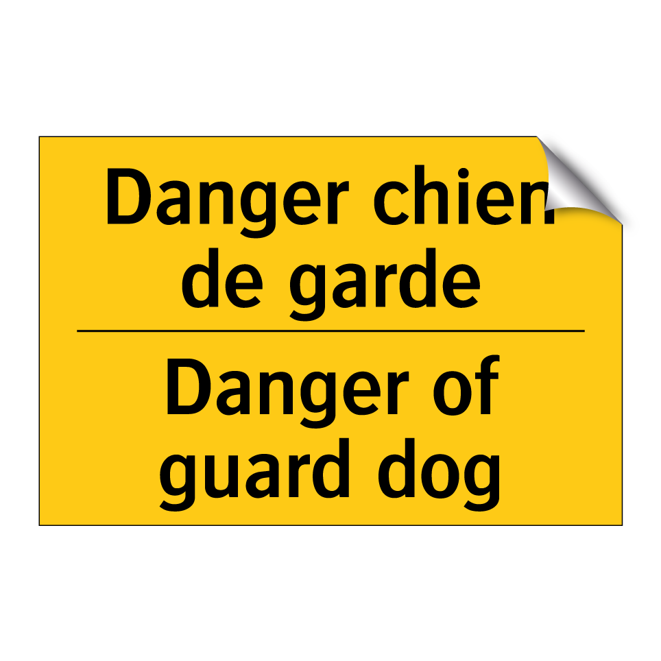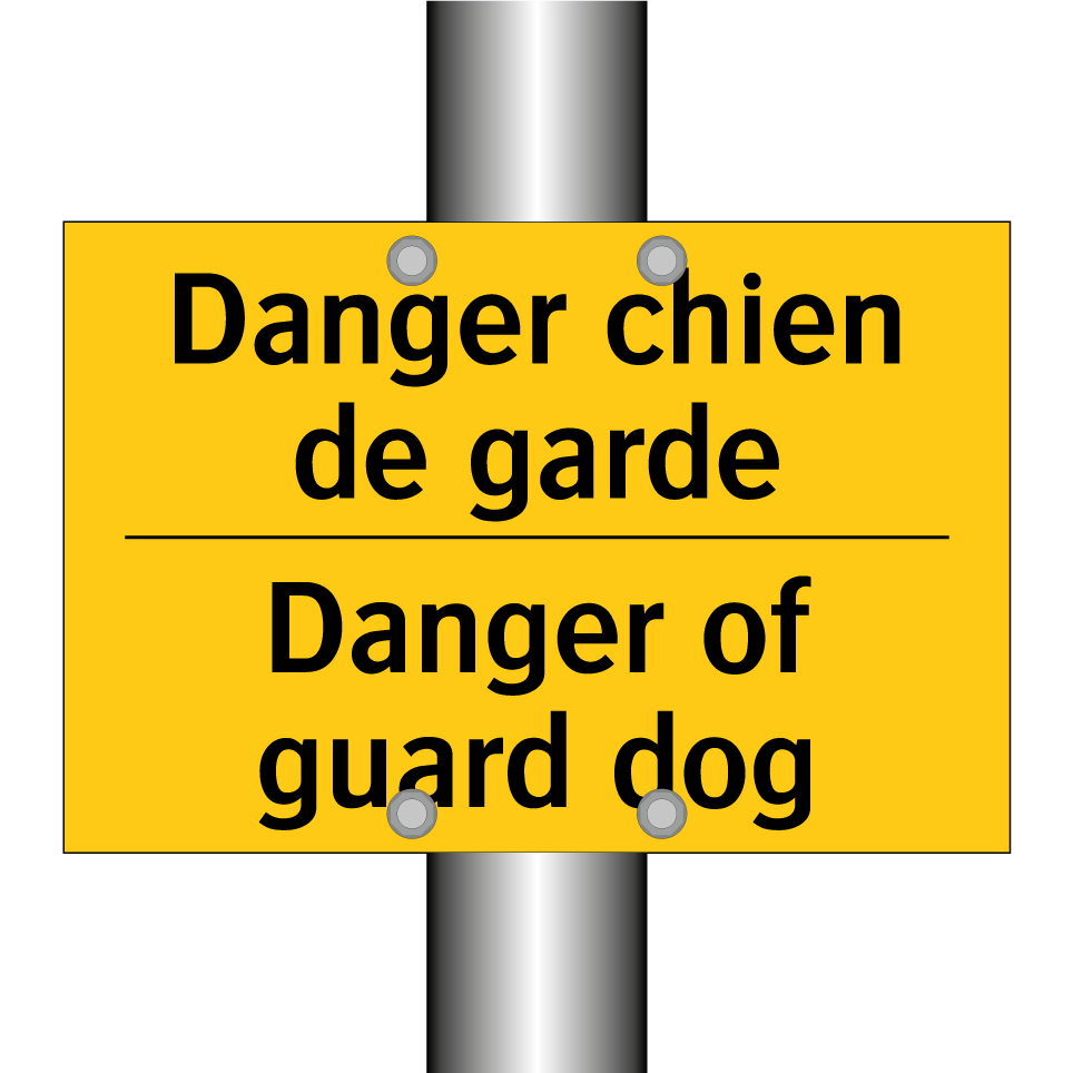 Panneau d'avertissement bilingue avec texte en français : "Danger chien de garde", et en anglais : "Danger of guard dog"