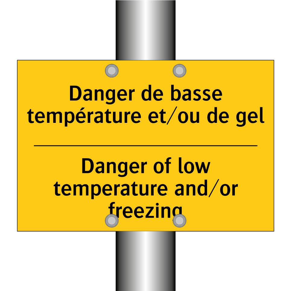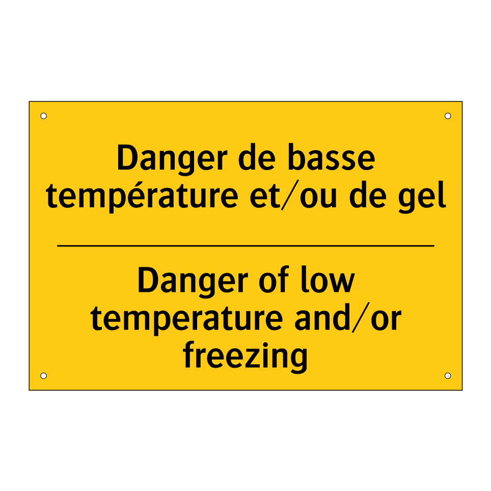 Panneau d'avertissement bilingue avec texte en français : "Danger de basse température et/ou de gel", et en anglais : "Danger of low temperature and/or freezing"