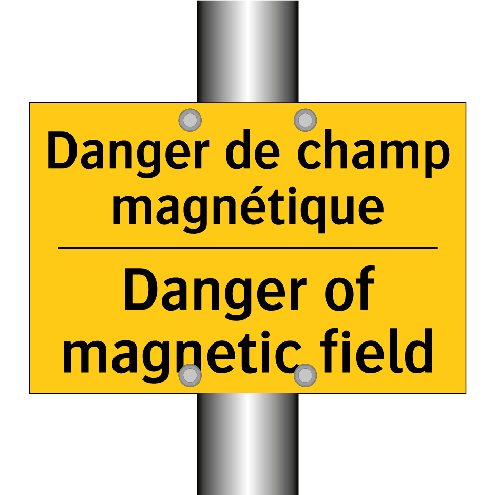 Panneau d'avertissement bilingue avec texte en français : "Danger de champ magnétique", et en anglais : "Danger of magnetic field"
