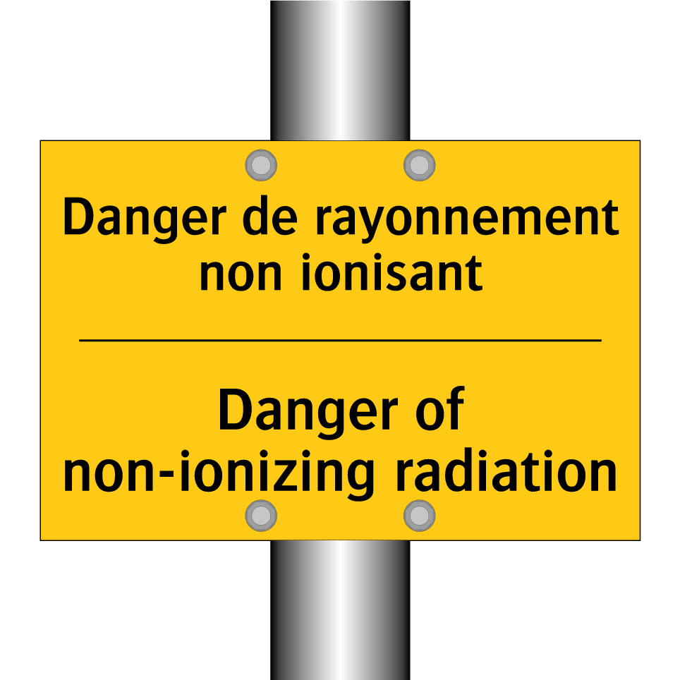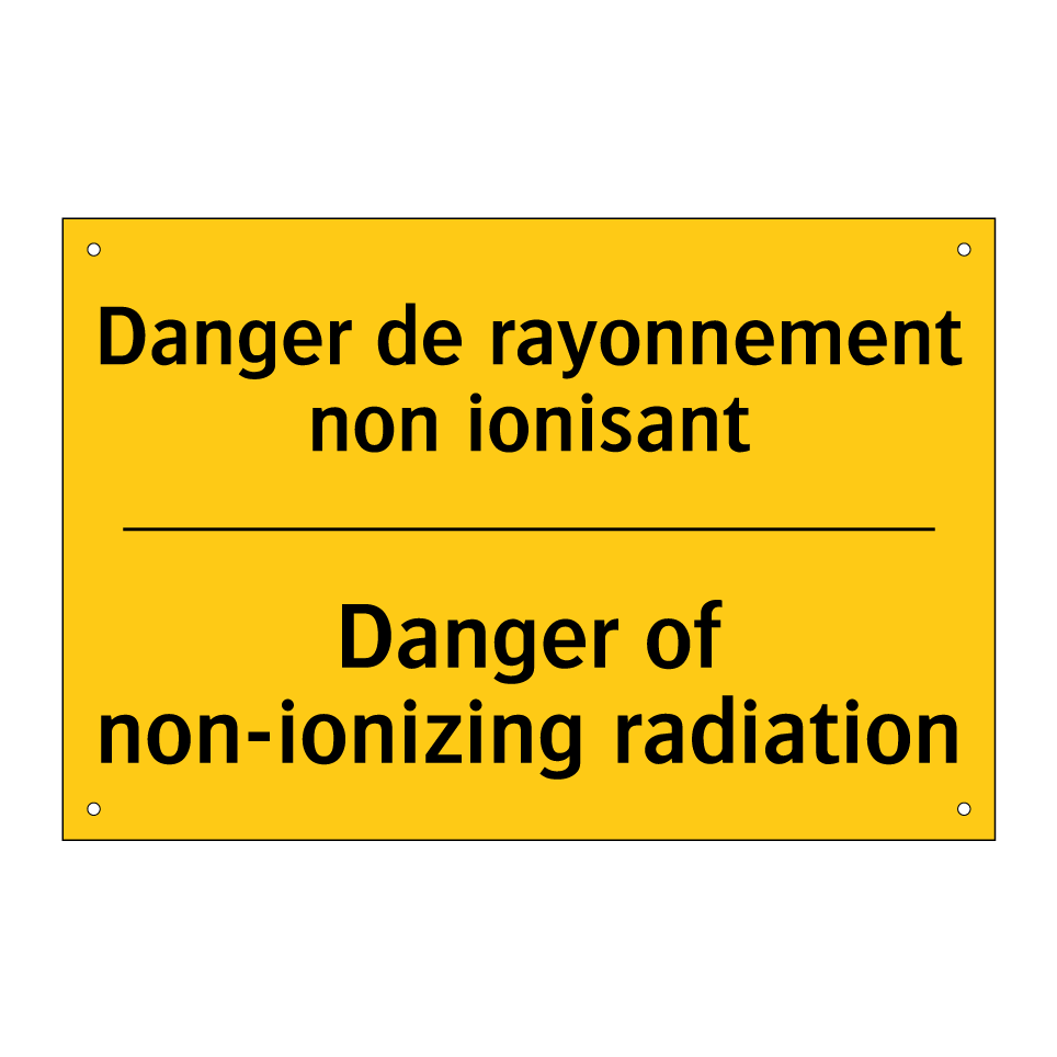 Panneau d'avertissement bilingue avec texte en français : "Danger de rayonnement non ionisant", et en anglais : "Danger of non-ionizing radiation"