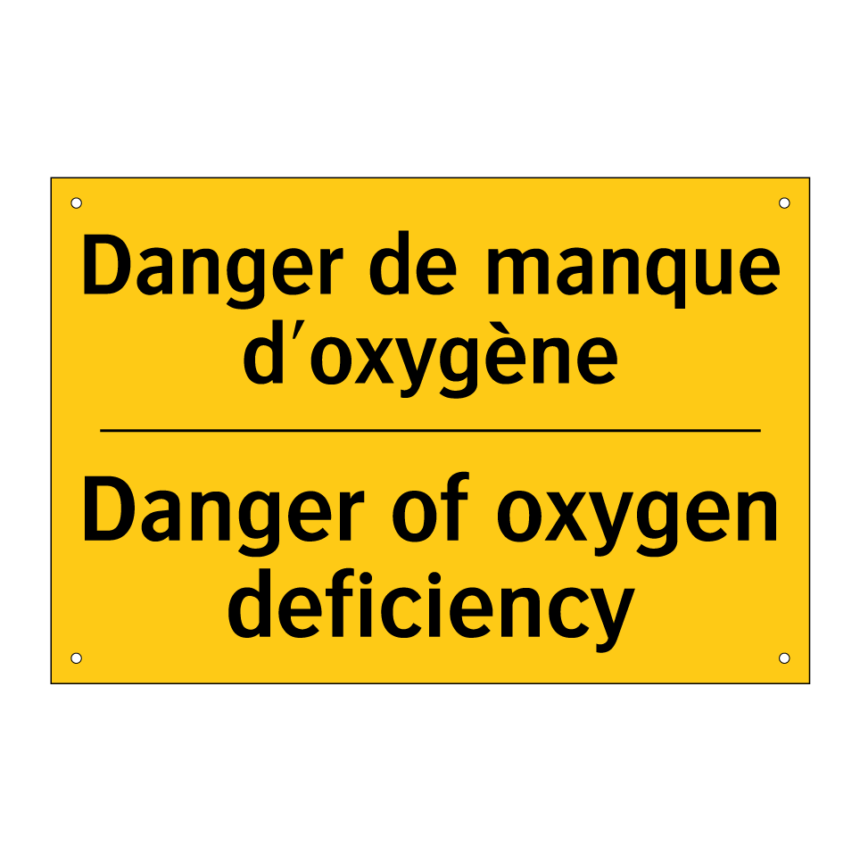 Panneau d'avertissement bilingue avec texte en français : "Danger de manque d'oxygène", et en anglais : "Danger of oxygen deficiency"