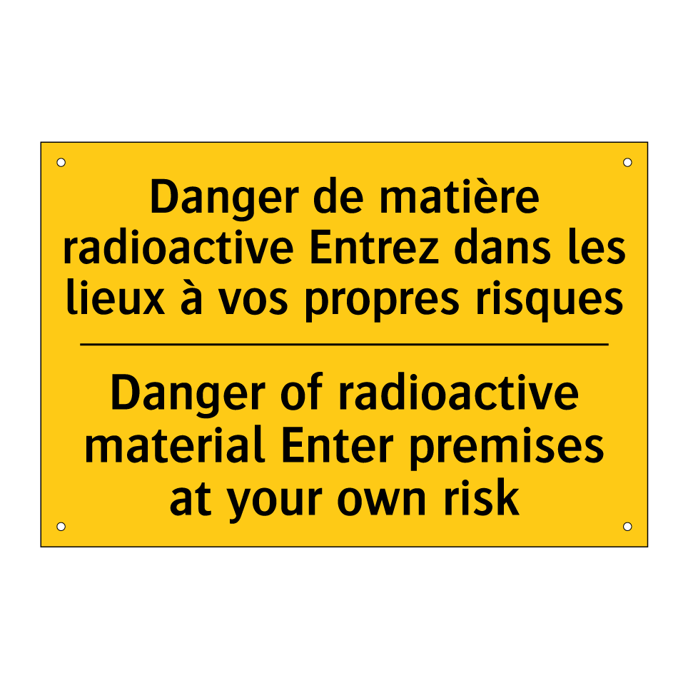 Panneau d'avertissement bilingue avec texte en français : "Danger de matière radioactive Entrez dans les lieux à vos propres risques", et en anglais : "Danger of radioactive material Enter premises at your own risk"