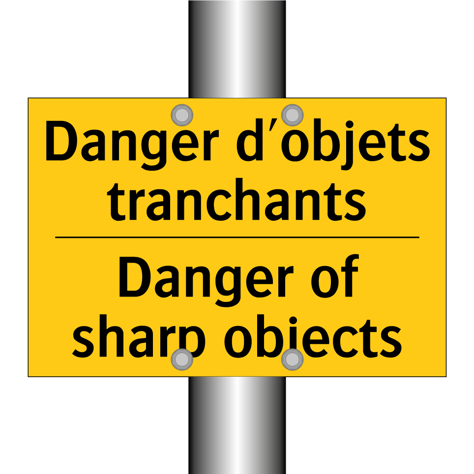 Panneau d'avertissement bilingue avec texte en français : "Danger d'objets tranchants", et en anglais : "Danger of sharp objects"