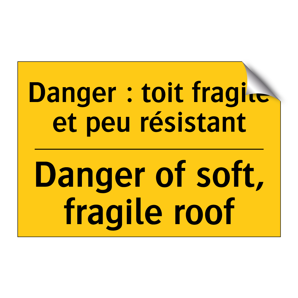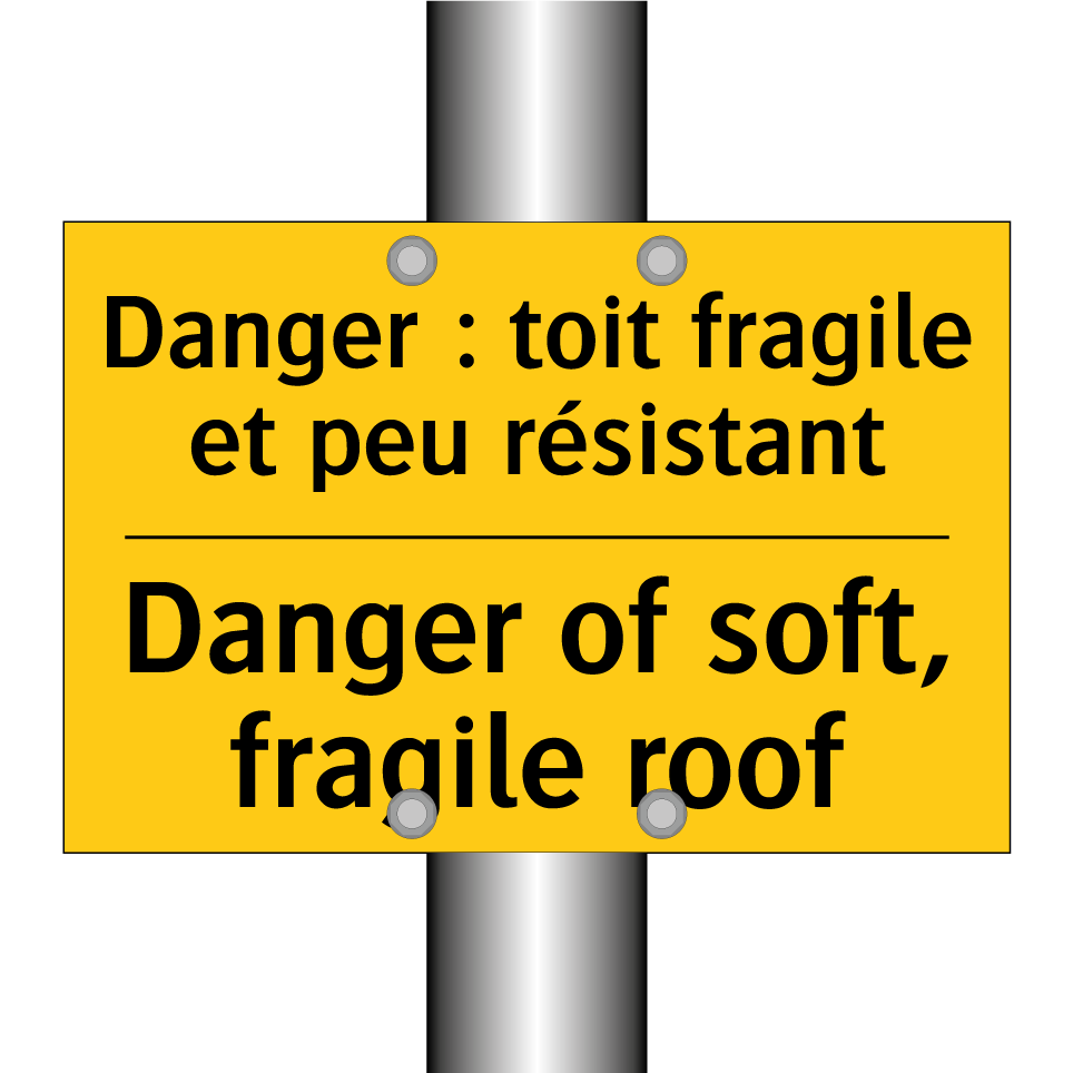 Panneau d'avertissement bilingue avec texte en français : "Danger : toit fragile et peu résistant", et en anglais : "Danger of soft, fragile roof"
