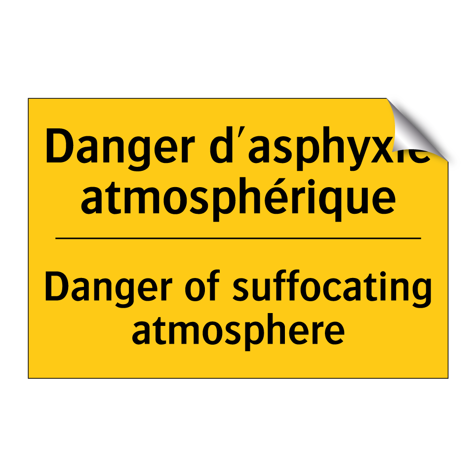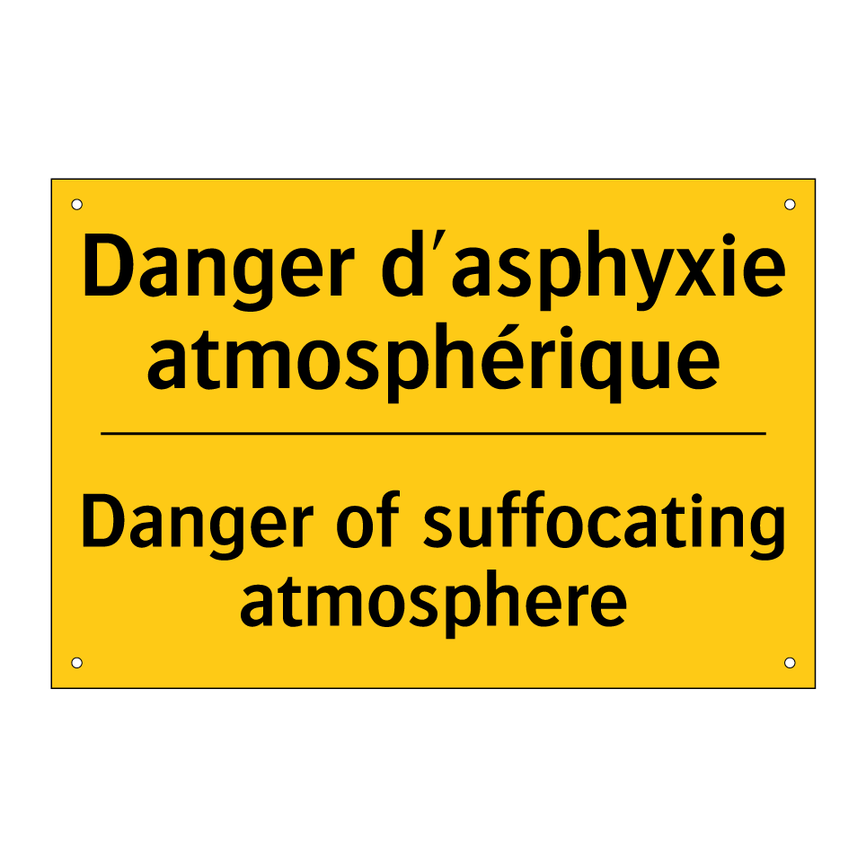 Panneau d'avertissement bilingue avec texte en français : "Danger d'asphyxie atmosphérique", et en anglais : "Danger of suffocating atmosphere"