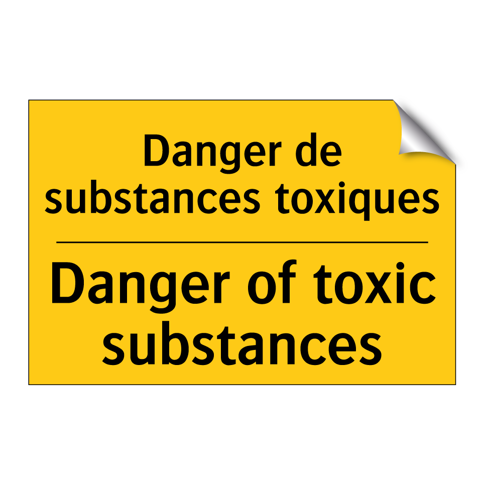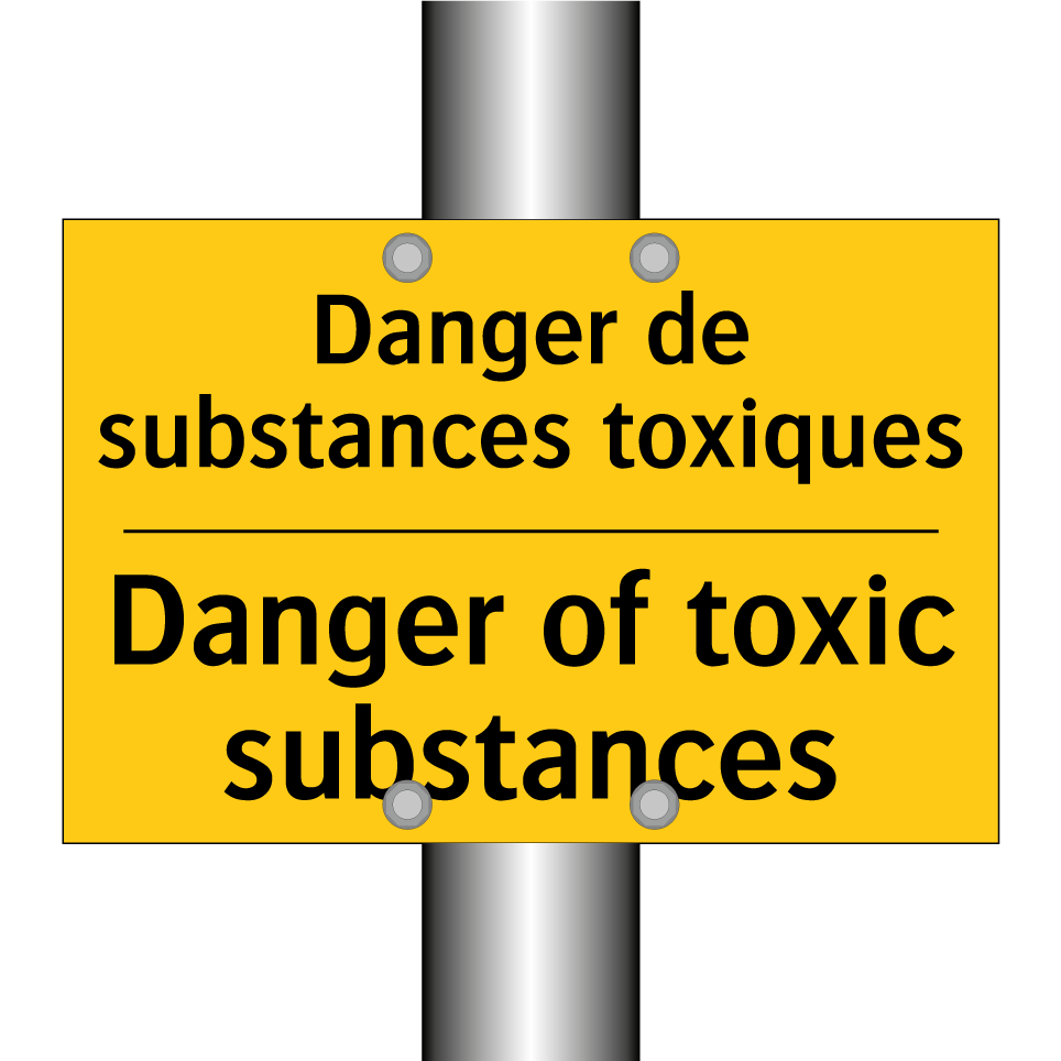 Panneau d'avertissement bilingue avec texte en français : "Danger de substances toxiques", et en anglais : "Danger of toxic substances"