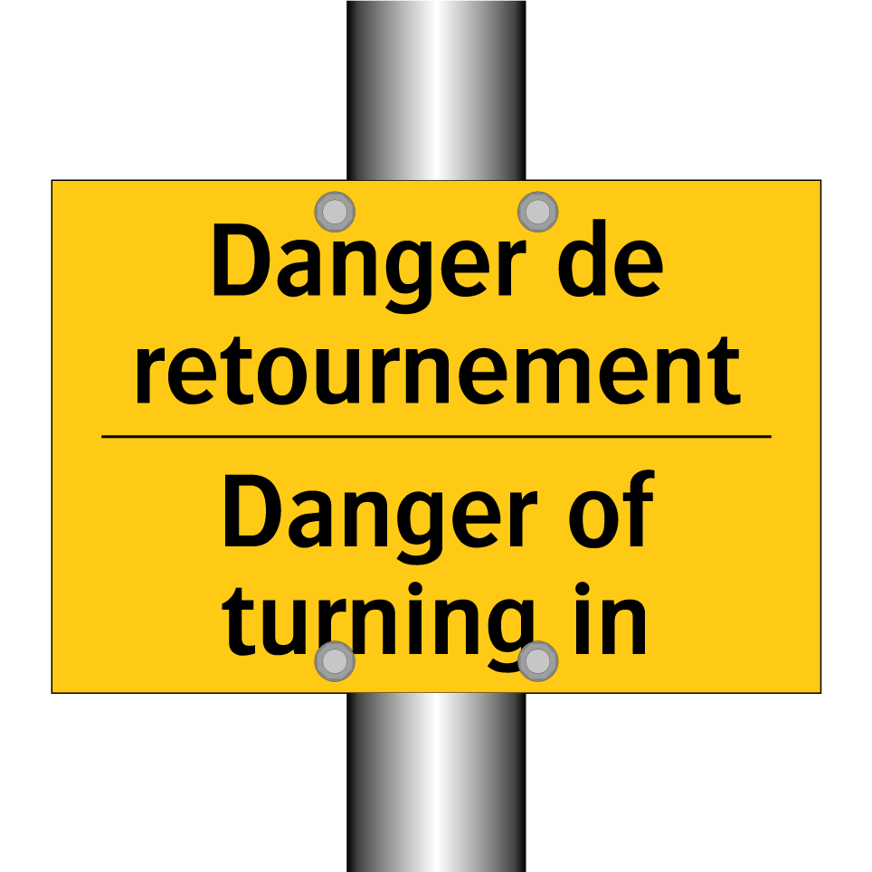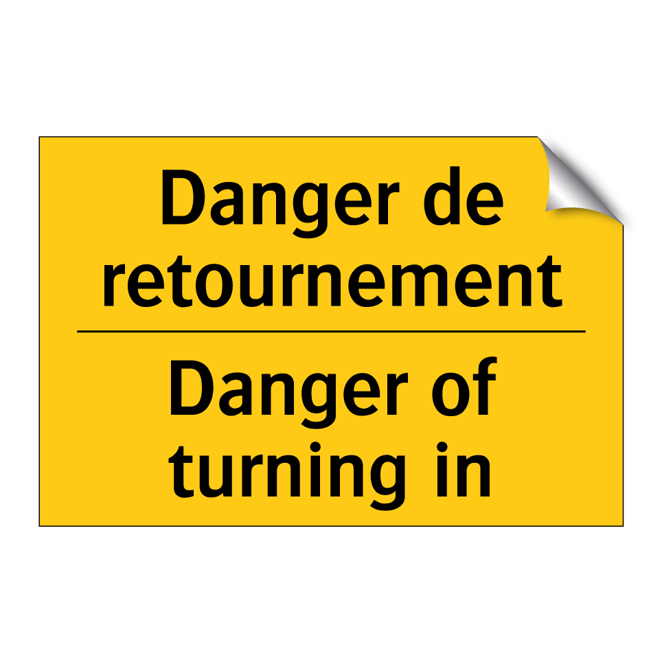 Panneau d'avertissement bilingue avec texte en français : "Danger de retournement", et en anglais : "Danger of turning in"