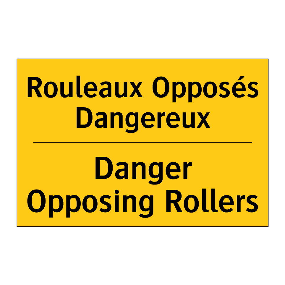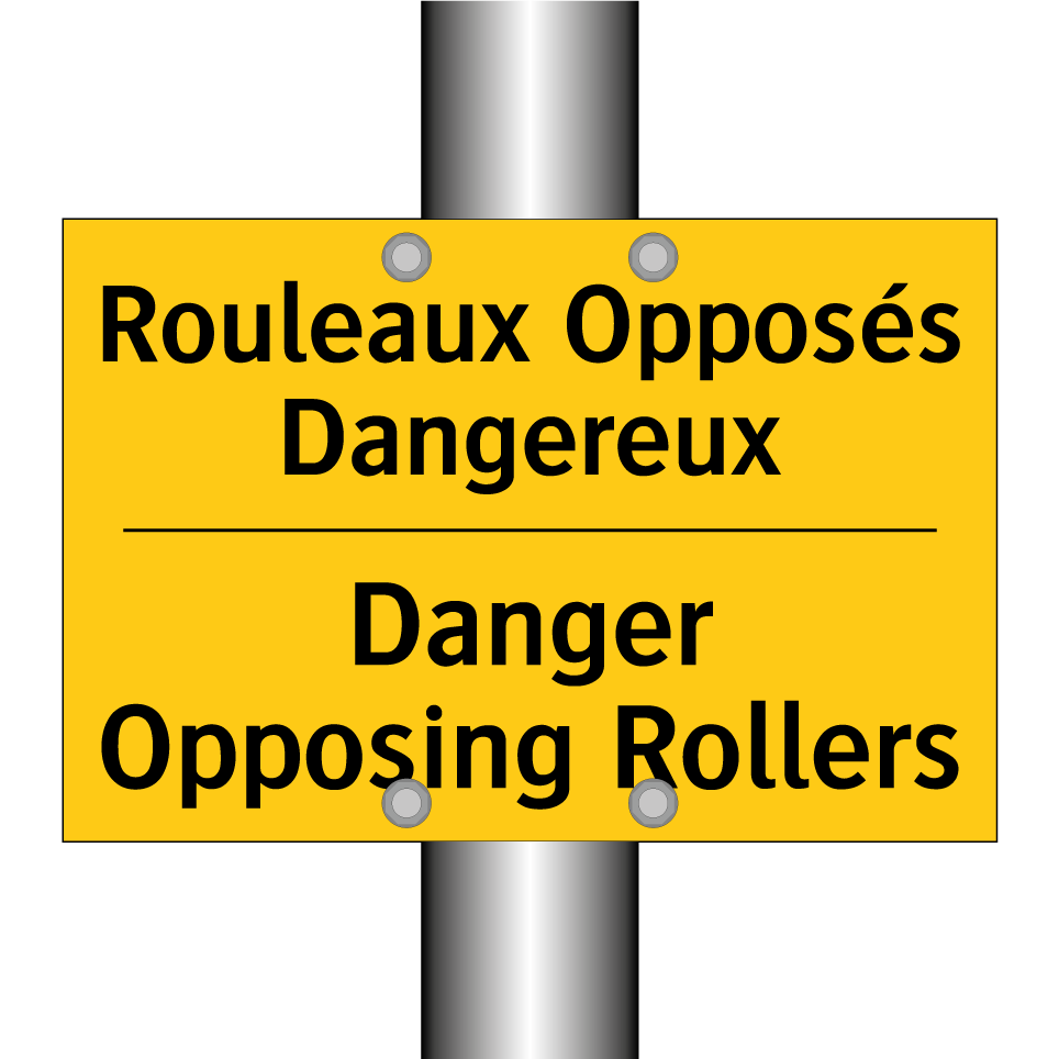 Panneau d'avertissement bilingue avec texte en français : "Rouleaux Opposés Dangereux", et en anglais : "Danger Opposing Rollers"