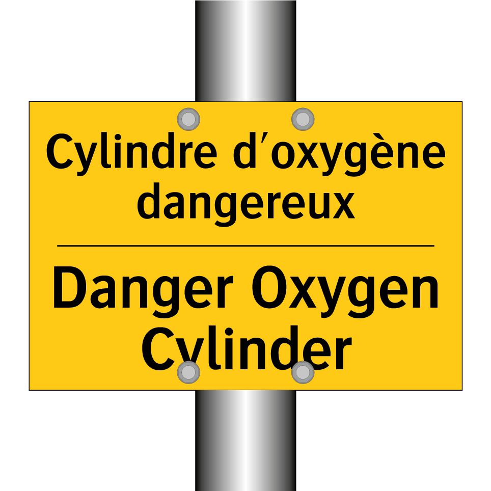 Panneau d'avertissement bilingue avec texte en français : "Cylindre d'oxygène dangereux", et en anglais : "Danger Oxygen Cylinder"