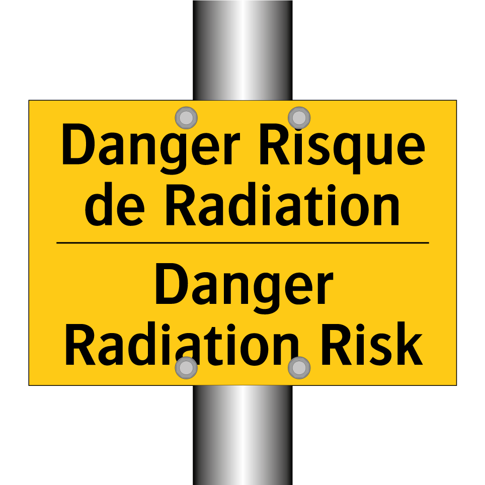Panneau d'avertissement bilingue avec texte en français : "Danger Risque de Radiation", et en anglais : "Danger Radiation Risk"