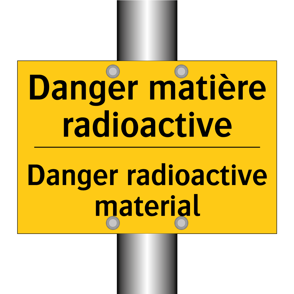 Panneau d'avertissement bilingue avec texte en français : "Danger matière radioactive", et en anglais : "Danger radioactive material"