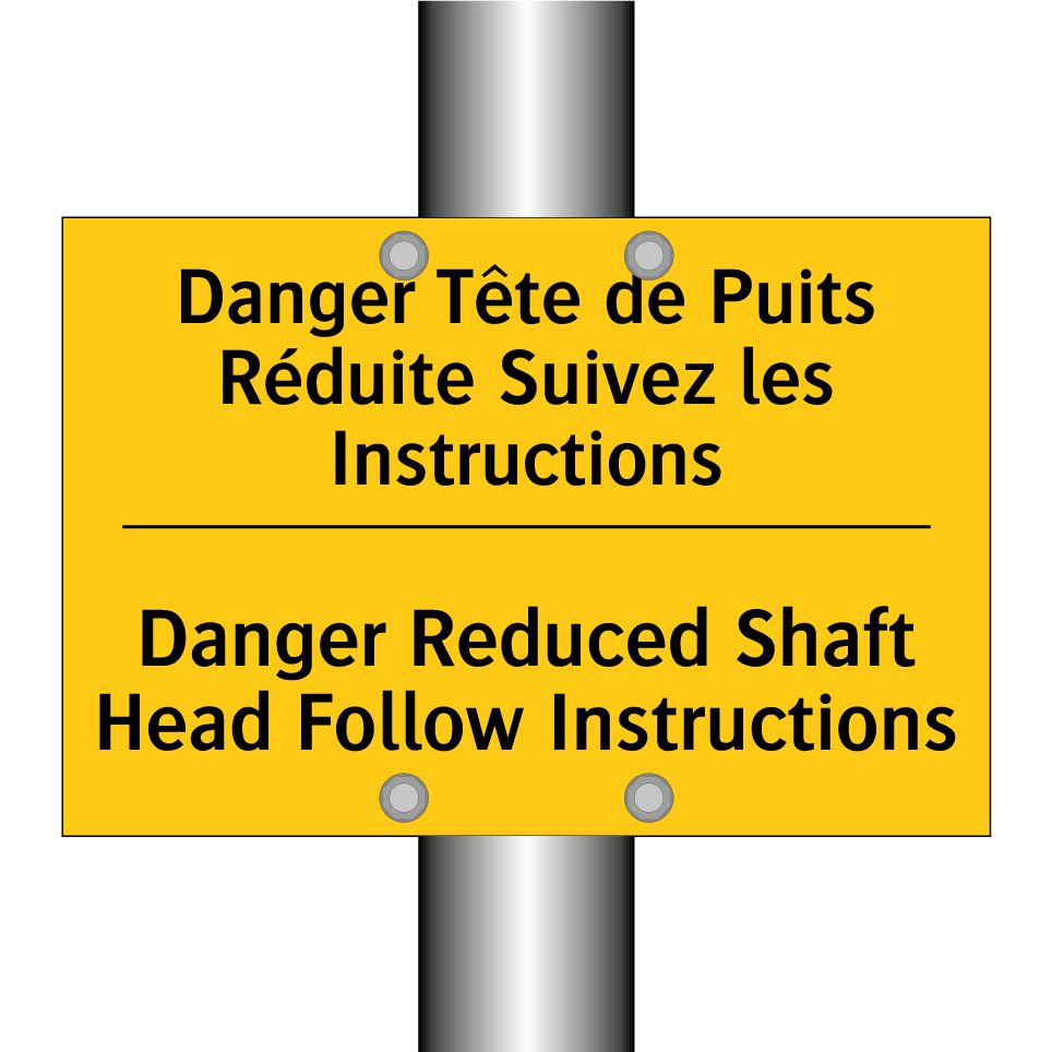 Panneau d'avertissement bilingue avec texte en français : "Danger Tête de Puits Réduite Suivez les Instructions", et en anglais : "Danger Reduced Shaft Head Follow Instructions"