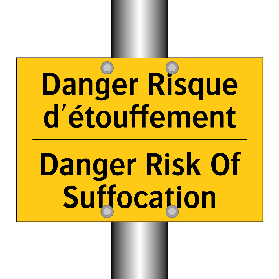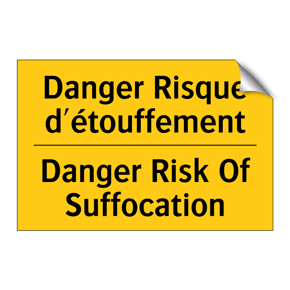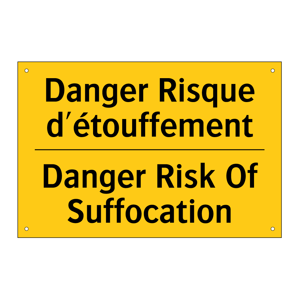 Panneau d'avertissement bilingue avec texte en français : "Danger Risque d'étouffement", et en anglais : "Danger Risk Of Suffocation"