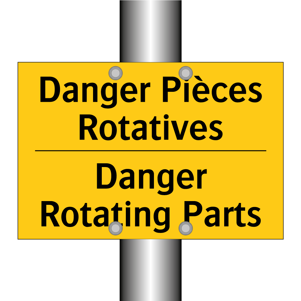 Panneau d'avertissement bilingue avec texte en français : "Danger Pièces Rotatives", et en anglais : "Danger Rotating Parts"
