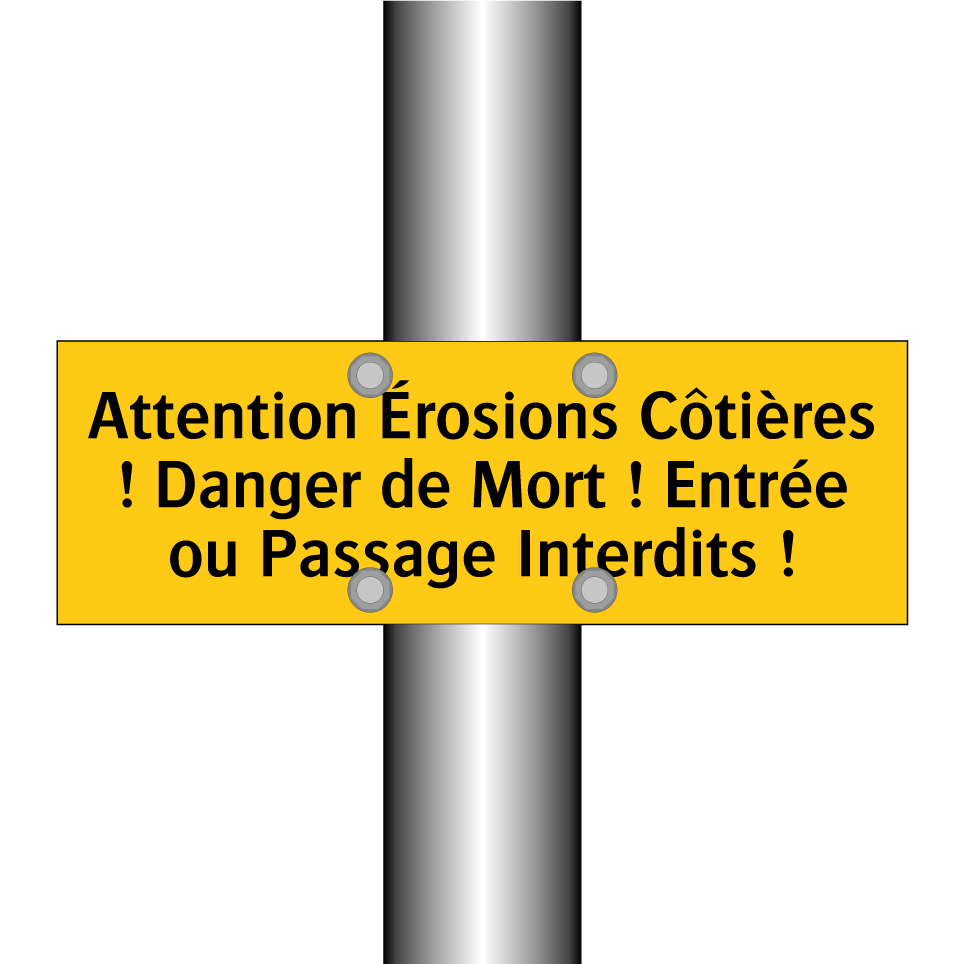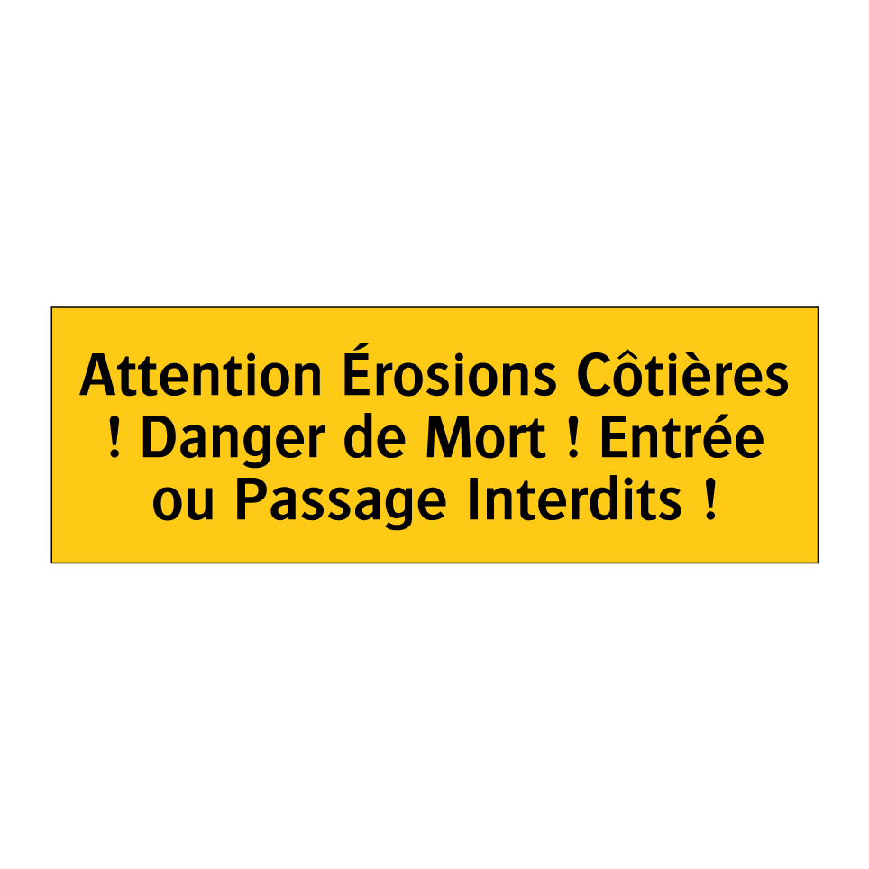 Panneau d'avertissement avec le texte : "Attention Érosions Côtières ! Danger de Mort ! Entrée ou Passage Interdits !"