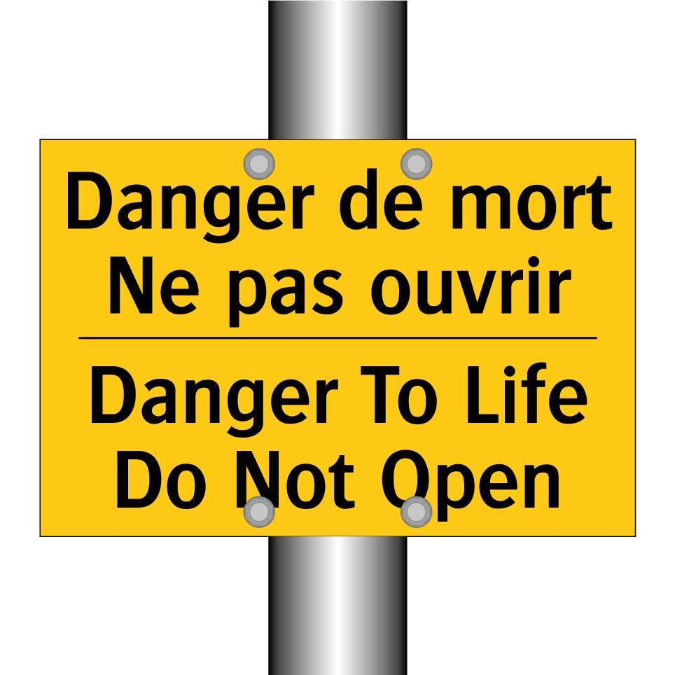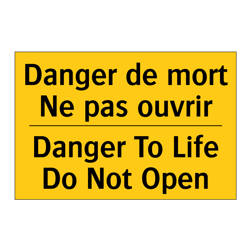 Panneau d'avertissement bilingue avec texte en français : "Danger de mort Ne pas ouvrir", et en anglais : "Danger To Life Do Not Open"
