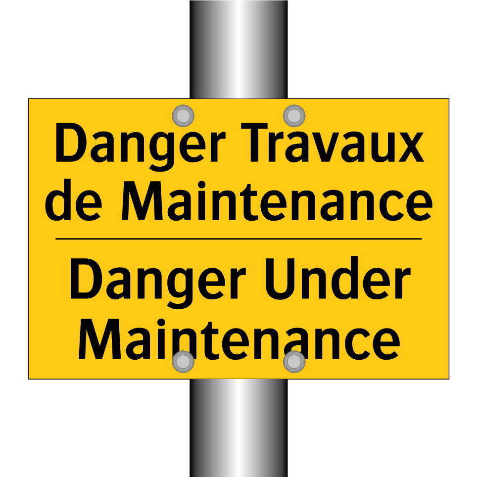 Panneau d'avertissement bilingue avec texte en français : "Danger Travaux de Maintenance", et en anglais : "Danger Under Maintenance"