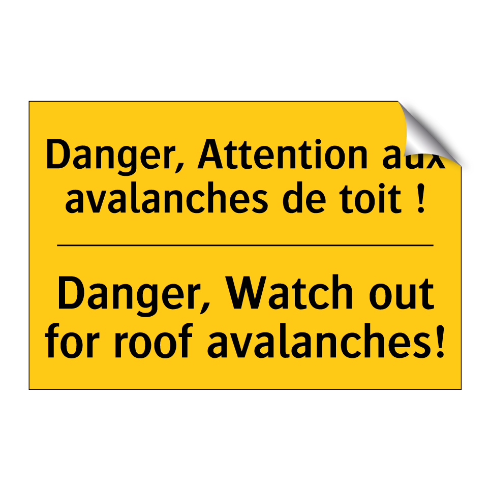 Panneau d'avertissement bilingue avec texte en français : "Danger, Attention aux avalanches de toit !", et en anglais : "Danger, Watch out for roof avalanches!"