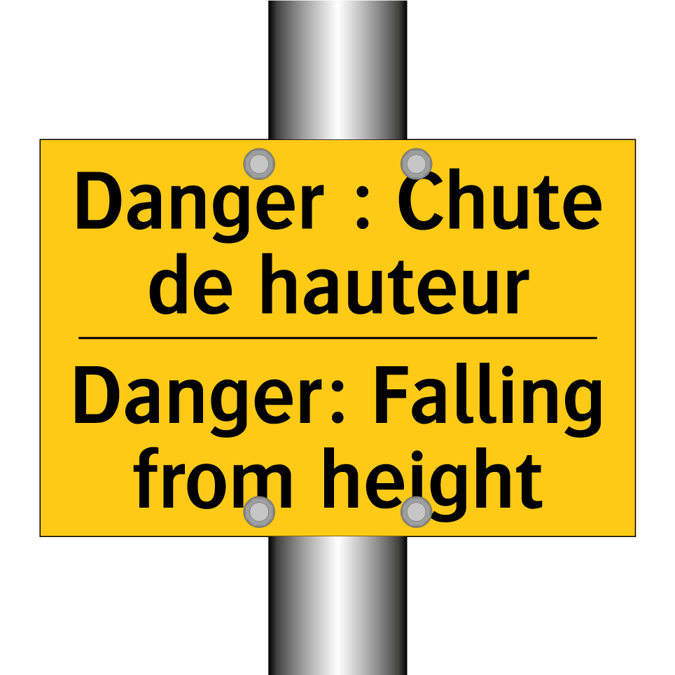 Panneau d'avertissement bilingue avec texte en français : "Danger : Chute de hauteur", et en anglais : "Danger: Falling from height"