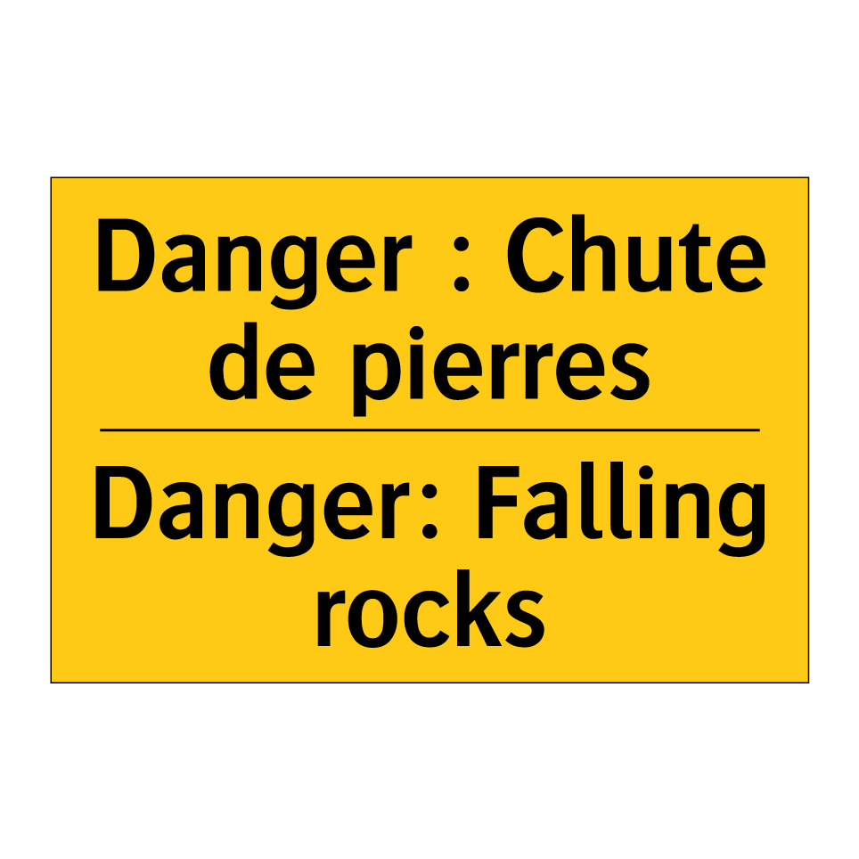 Panneau d'avertissement bilingue avec texte en français : "Danger : Chute de pierres", et en anglais : "Danger: Falling rocks"