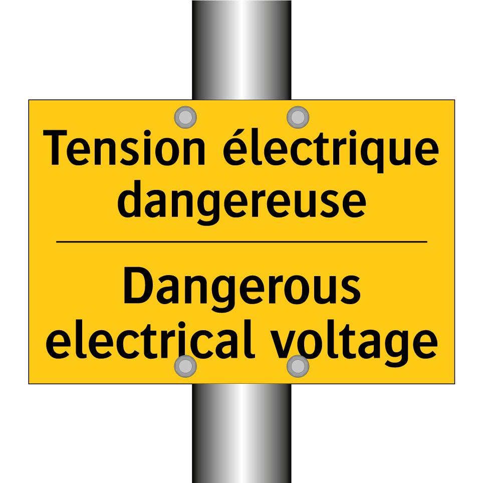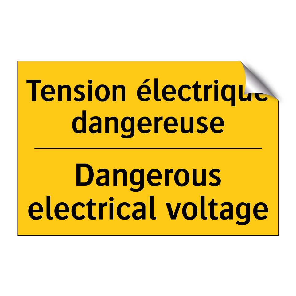 Panneau d'avertissement bilingue avec texte en français : "Tension électrique dangereuse", et en anglais : "Dangerous electrical voltage"