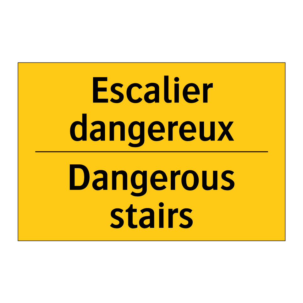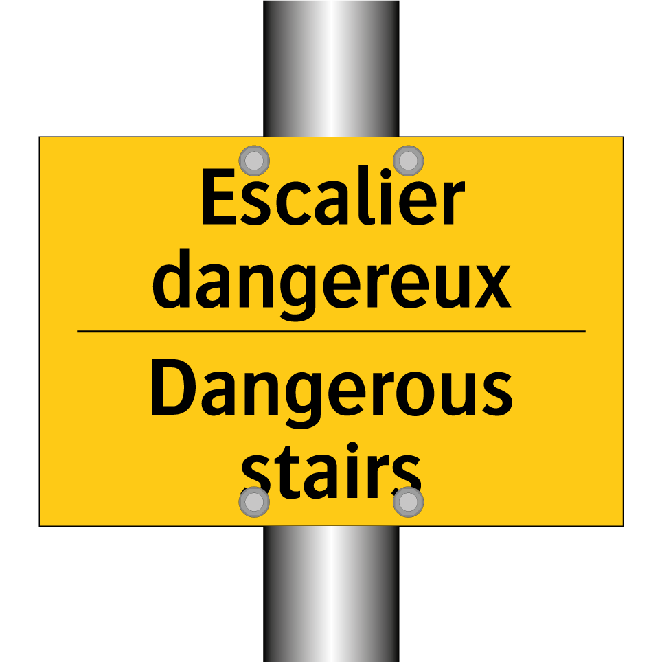 Panneau d'avertissement bilingue avec texte en français : "Escalier dangereux", et en anglais : "Dangerous stairs"