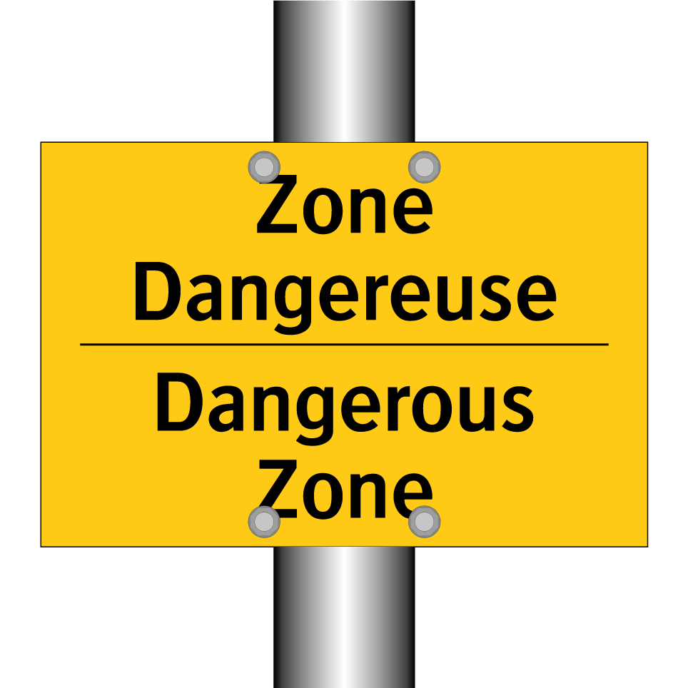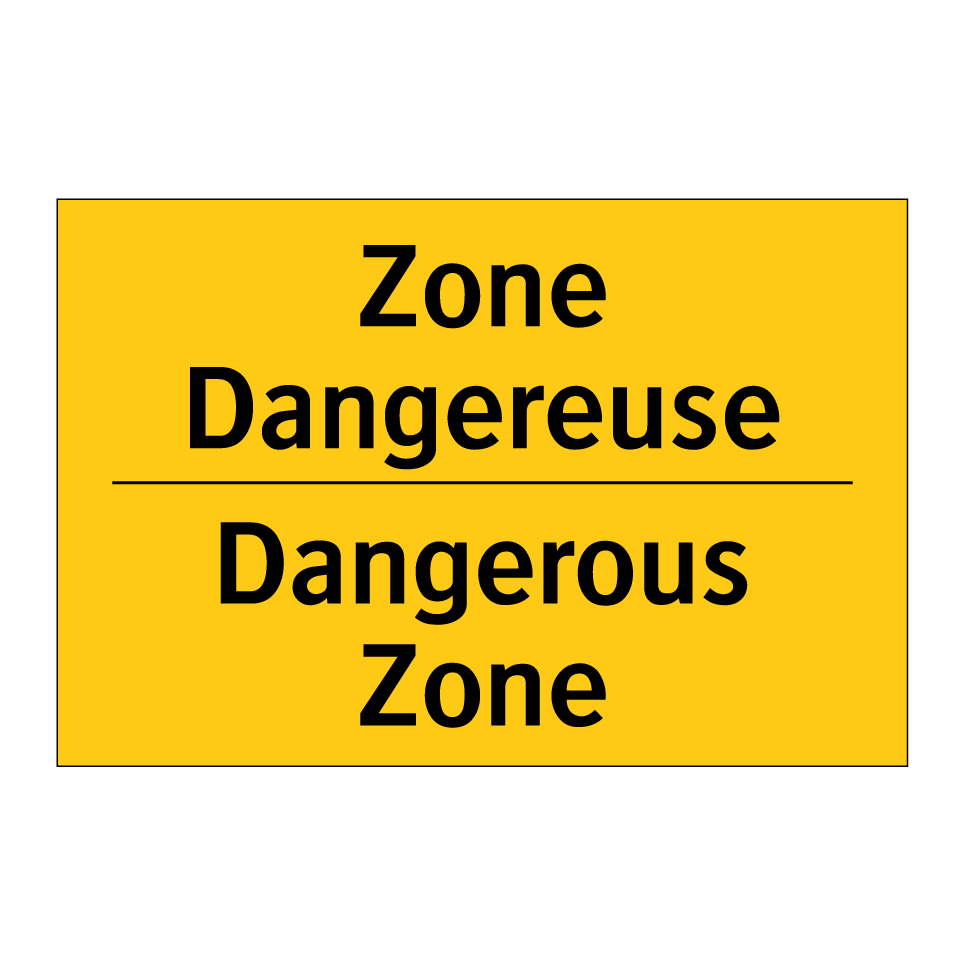 Panneau d'avertissement bilingue avec texte en français : "Zone Dangereuse", et en anglais : "Dangerous Zone"