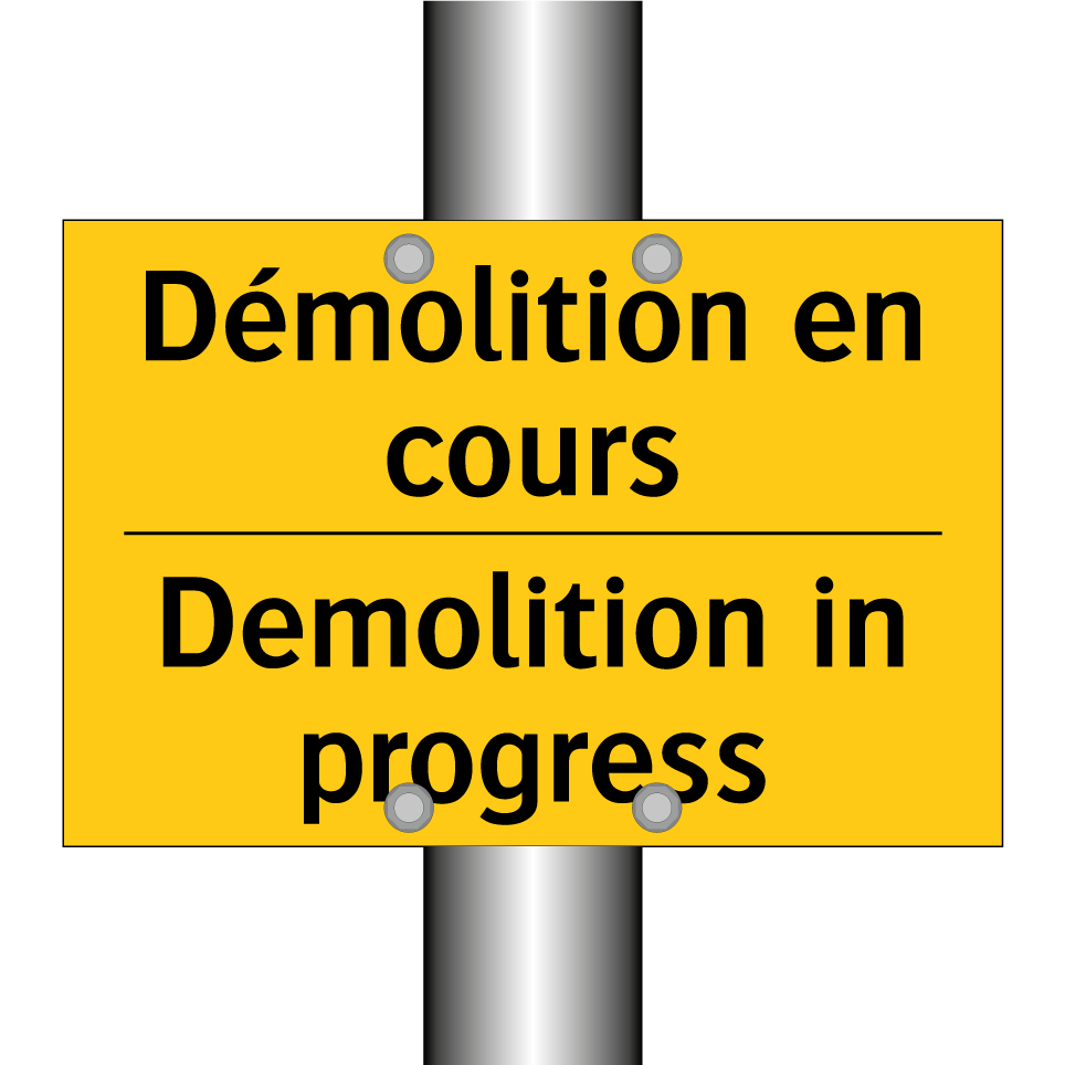 Panneau d'avertissement bilingue avec texte en français : "Démolition en cours", et en anglais : "Demolition in progress"