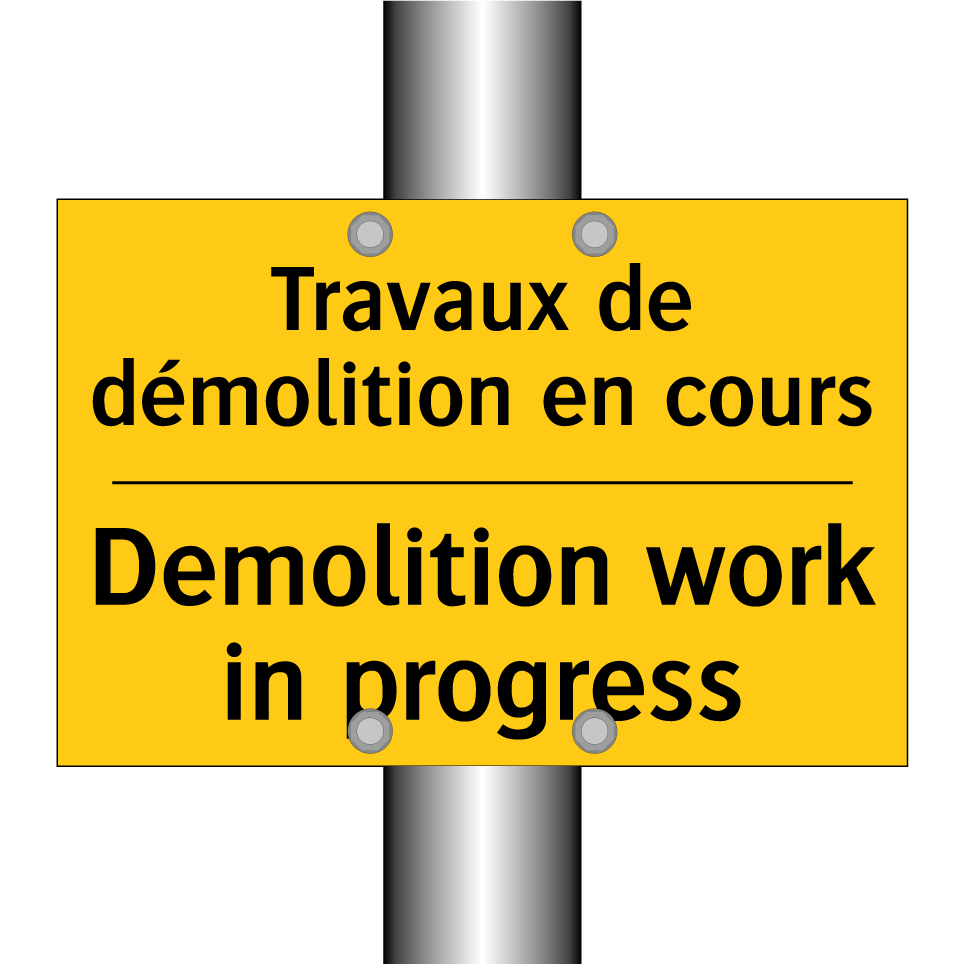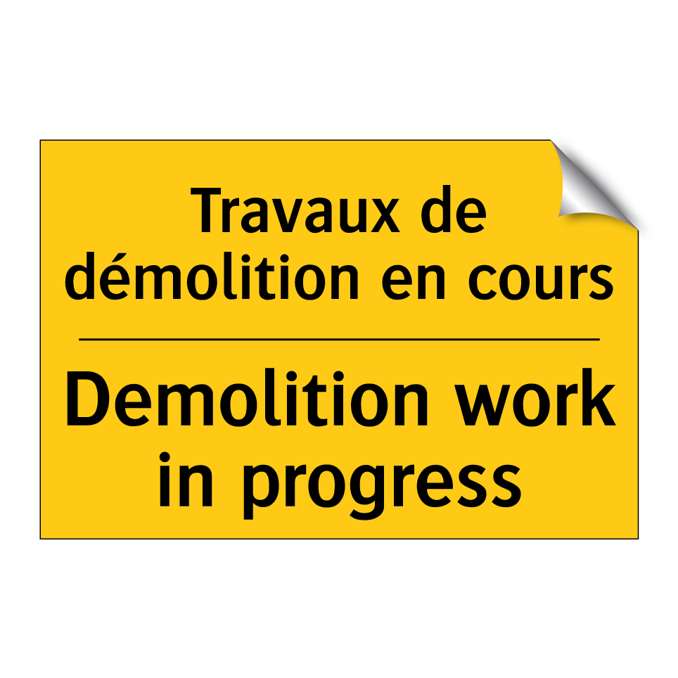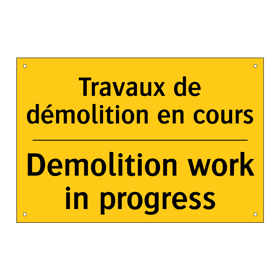 Panneau d'avertissement bilingue avec texte en français : "Travaux de démolition en cours", et en anglais : "Demolition work in progress"