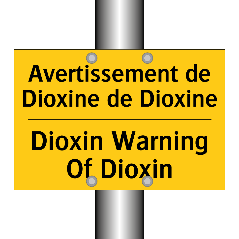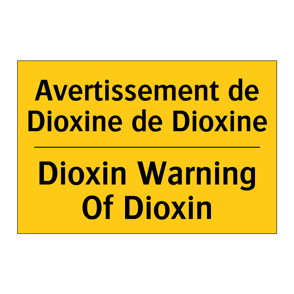 Panneau d'avertissement bilingue avec texte en français : "Avertissement de Dioxine de Dioxine", et en anglais : "Dioxin Warning Of Dioxin"