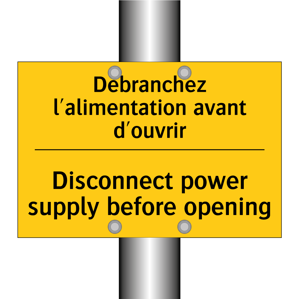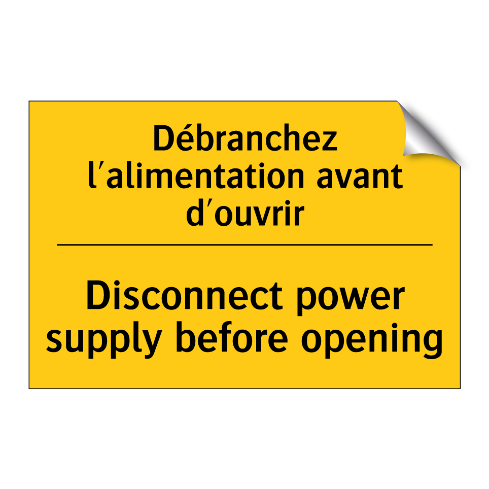 Panneau d'avertissement bilingue avec texte en français : "Débranchez l'alimentation avant d'ouvrir", et en anglais : "Disconnect power supply before opening"