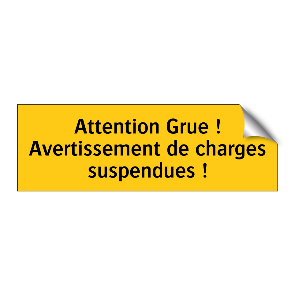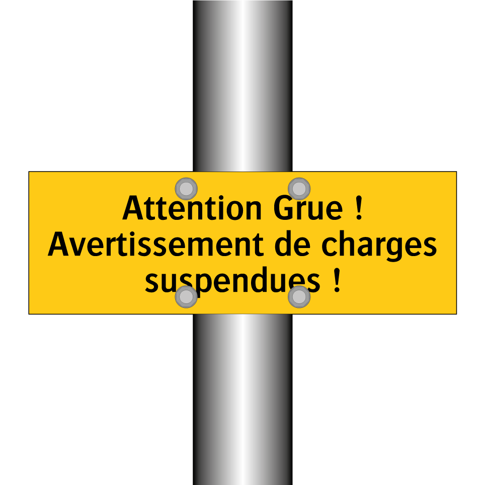 Panneau d'avertissement avec le texte : "Attention Grue ! Avertissement de charges suspendues !"