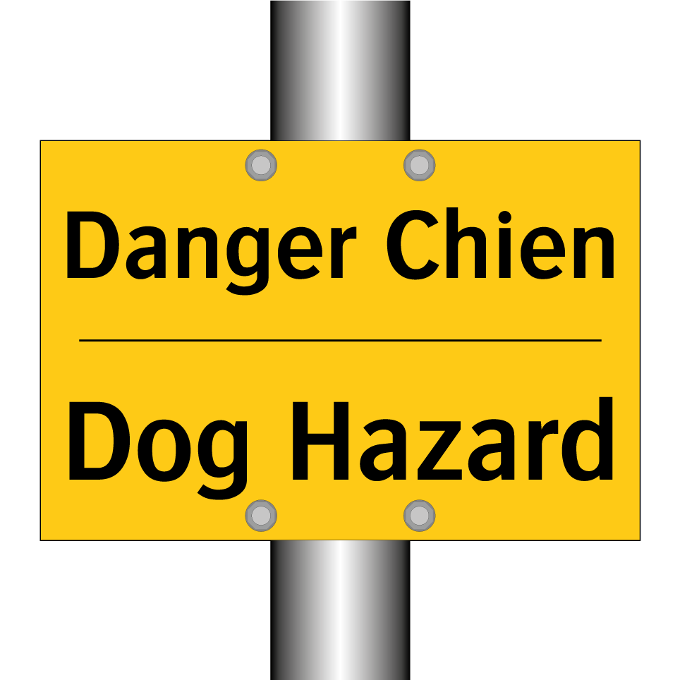 Panneau d'avertissement bilingue avec texte en français : "Danger Chien", et en anglais : "Dog Hazard"