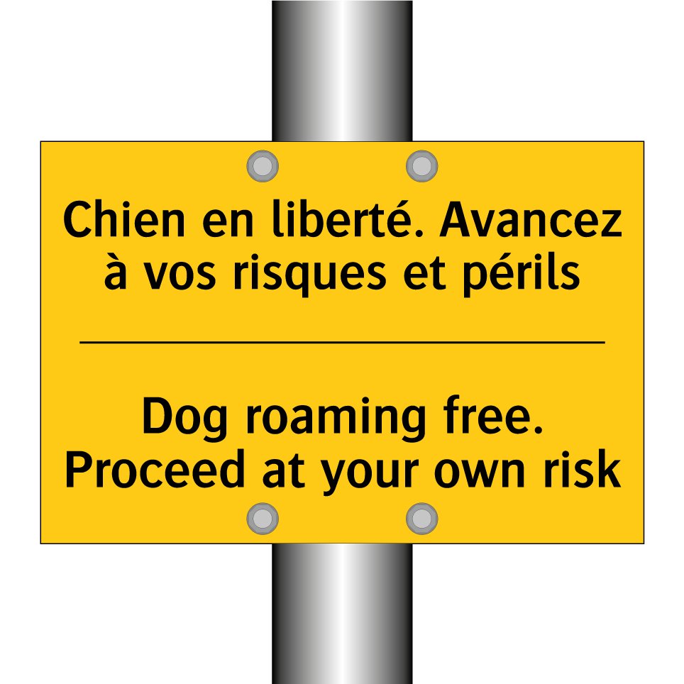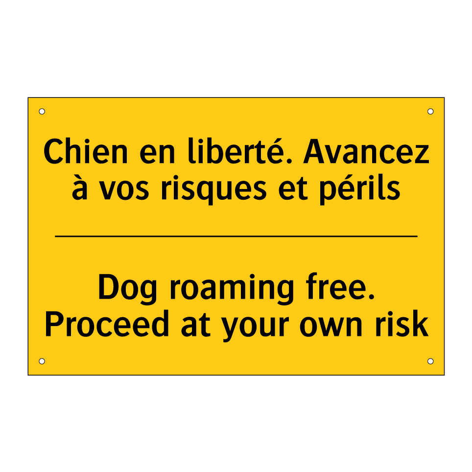 Panneau d'avertissement bilingue avec texte en français : "Chien en liberté. Avancez à vos risques et périls", et en anglais : "Dog roaming free. Proceed at your own risk"
