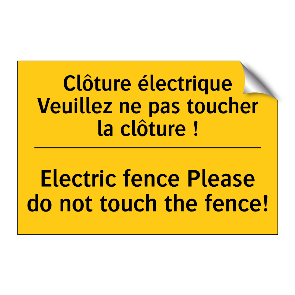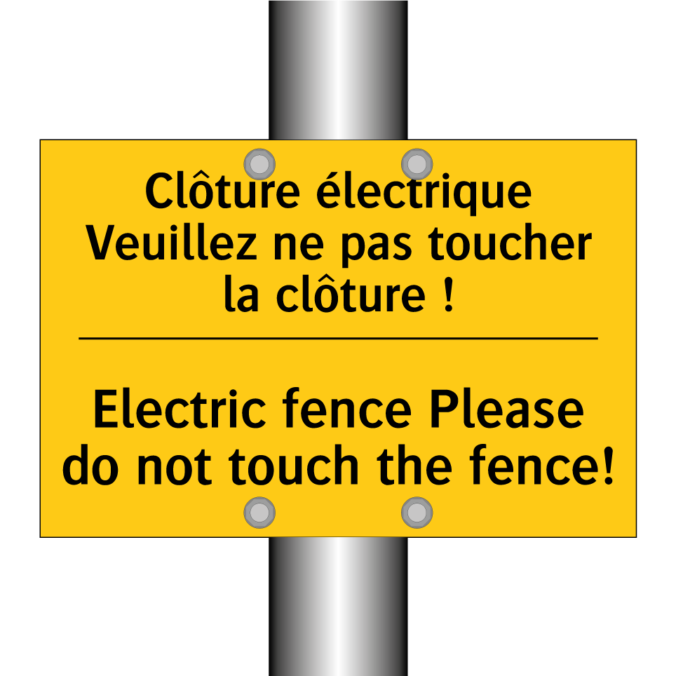 Panneau d'avertissement bilingue avec texte en français : "Clôture électrique Veuillez ne pas toucher la clôture !", et en anglais : "Electric fence Please do not touch the fence!"
