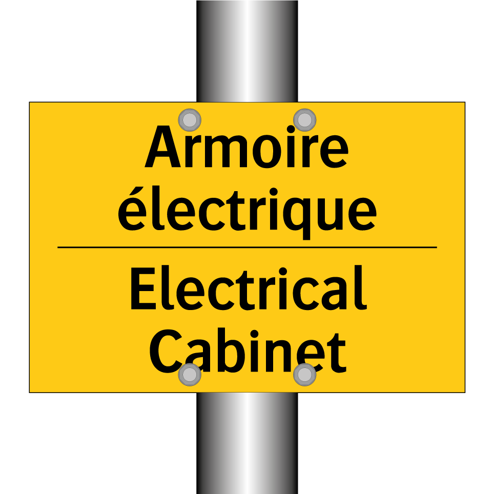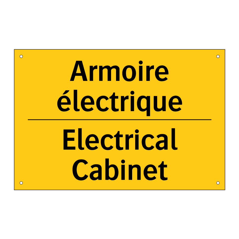 Panneau d'avertissement bilingue avec texte en français : "Armoire électrique", et en anglais : "Electrical Cabinet"