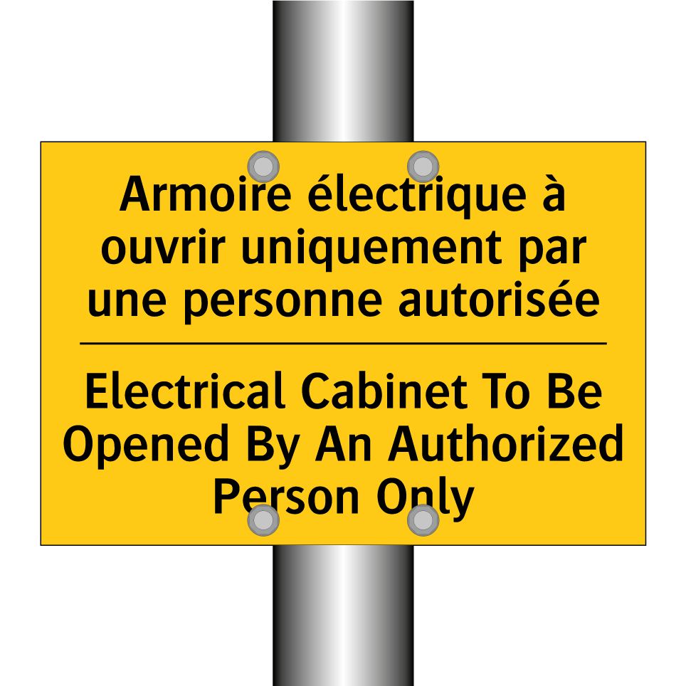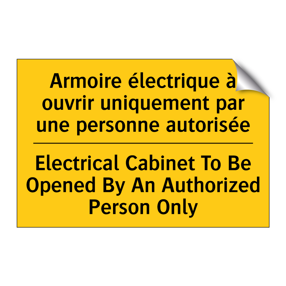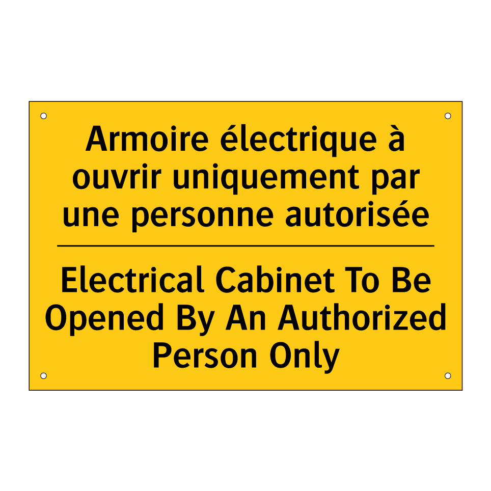 Panneau d'avertissement bilingue avec texte en français : "Armoire électrique à ouvrir uniquement par une personne autorisée", et en anglais : "Electrical Cabinet To Be Opened By An Authorized Person Only"