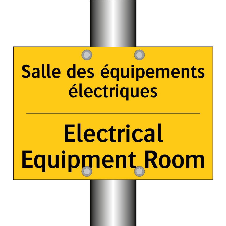 Panneau d'avertissement bilingue avec texte en français : "Salle des équipements électriques", et en anglais : "Electrical Equipment Room"