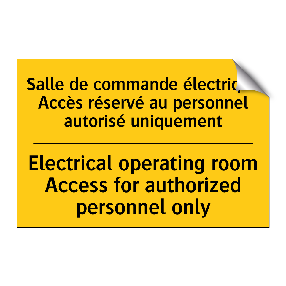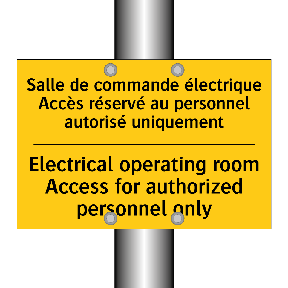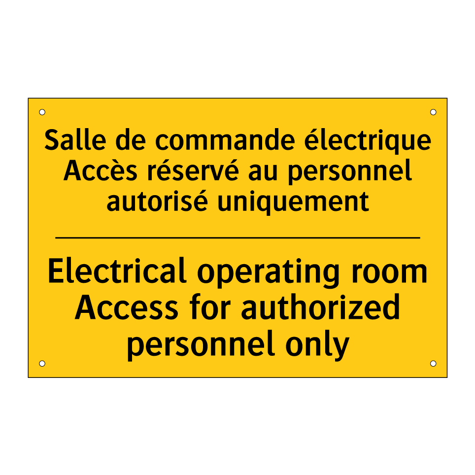 Panneau d'avertissement bilingue avec texte en français : "Salle de commande électrique Accès réservé au personnel autorisé uniquement", et en anglais : "Electrical operating room Access for authorized personnel only"