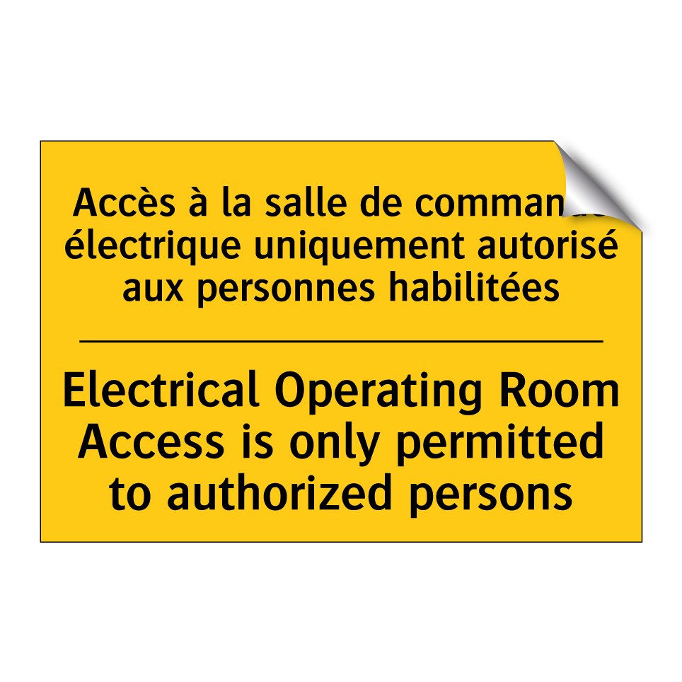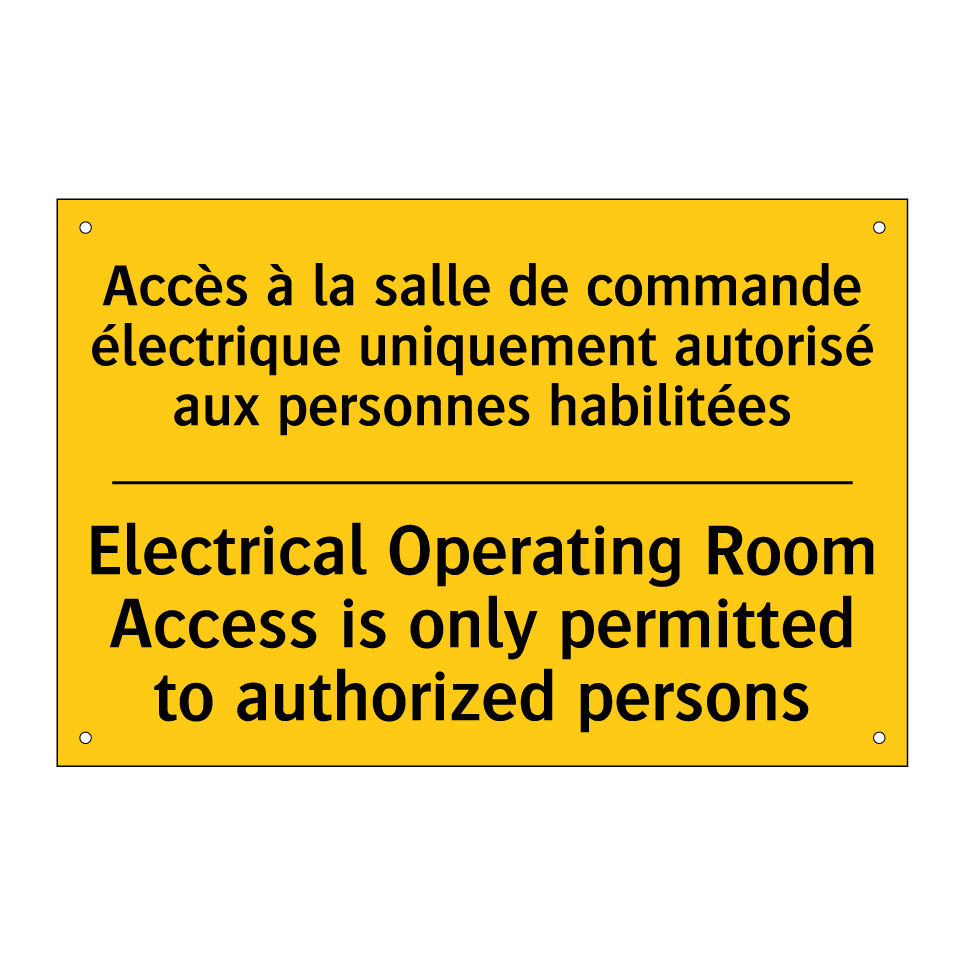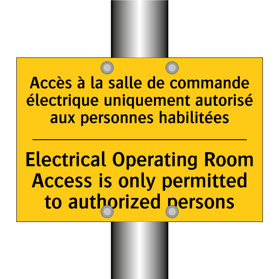 Panneau d'avertissement bilingue avec texte en français : "Accès à la salle de commande électrique uniquement autorisé aux personnes habilitées", et en anglais : "Electrical Operating Room Access is only permitted to authorized persons"