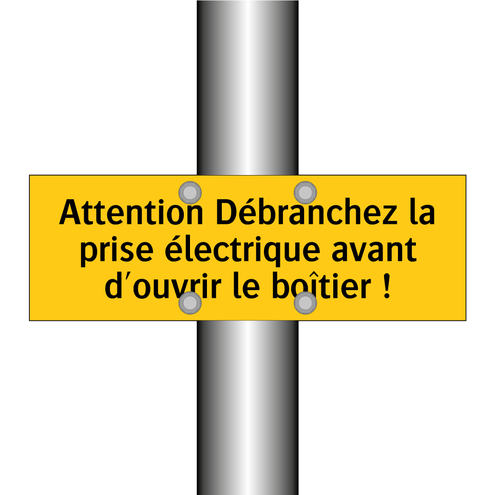 Panneau d'avertissement avec le texte : "Attention Débranchez la prise électrique avant d'ouvrir le boîtier !"