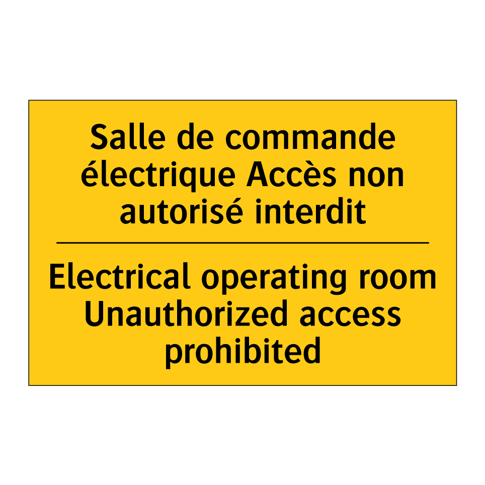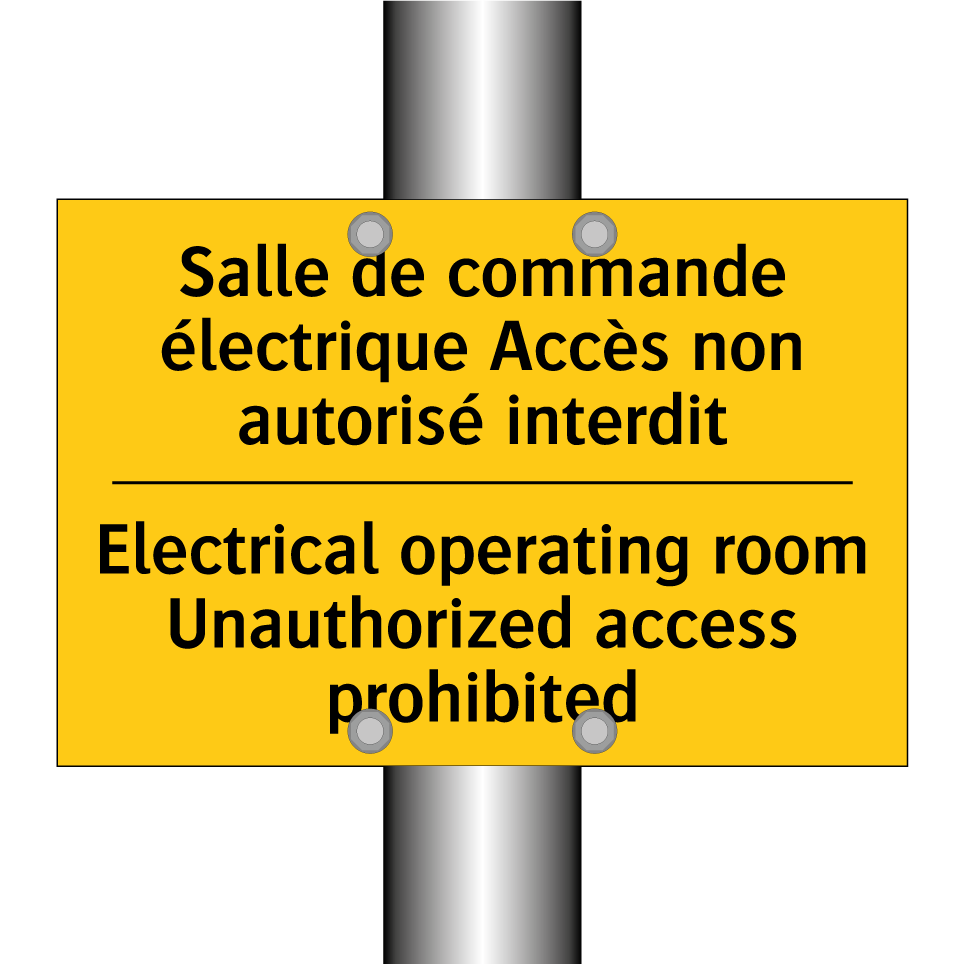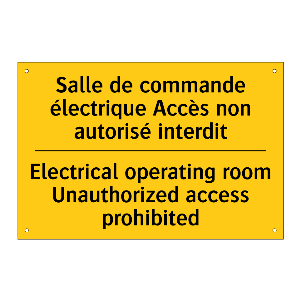 Panneau d'avertissement bilingue avec texte en français : "Salle de commande électrique Accès non autorisé interdit", et en anglais : "Electrical operating room Unauthorized access prohibited"