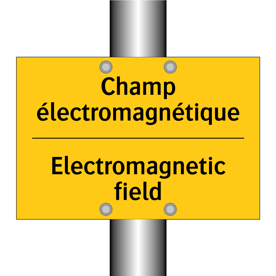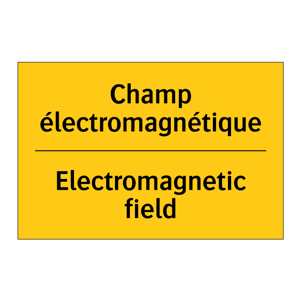Panneau d'avertissement bilingue avec texte en français : "Champ électromagnétique", et en anglais : "Electromagnetic field"
