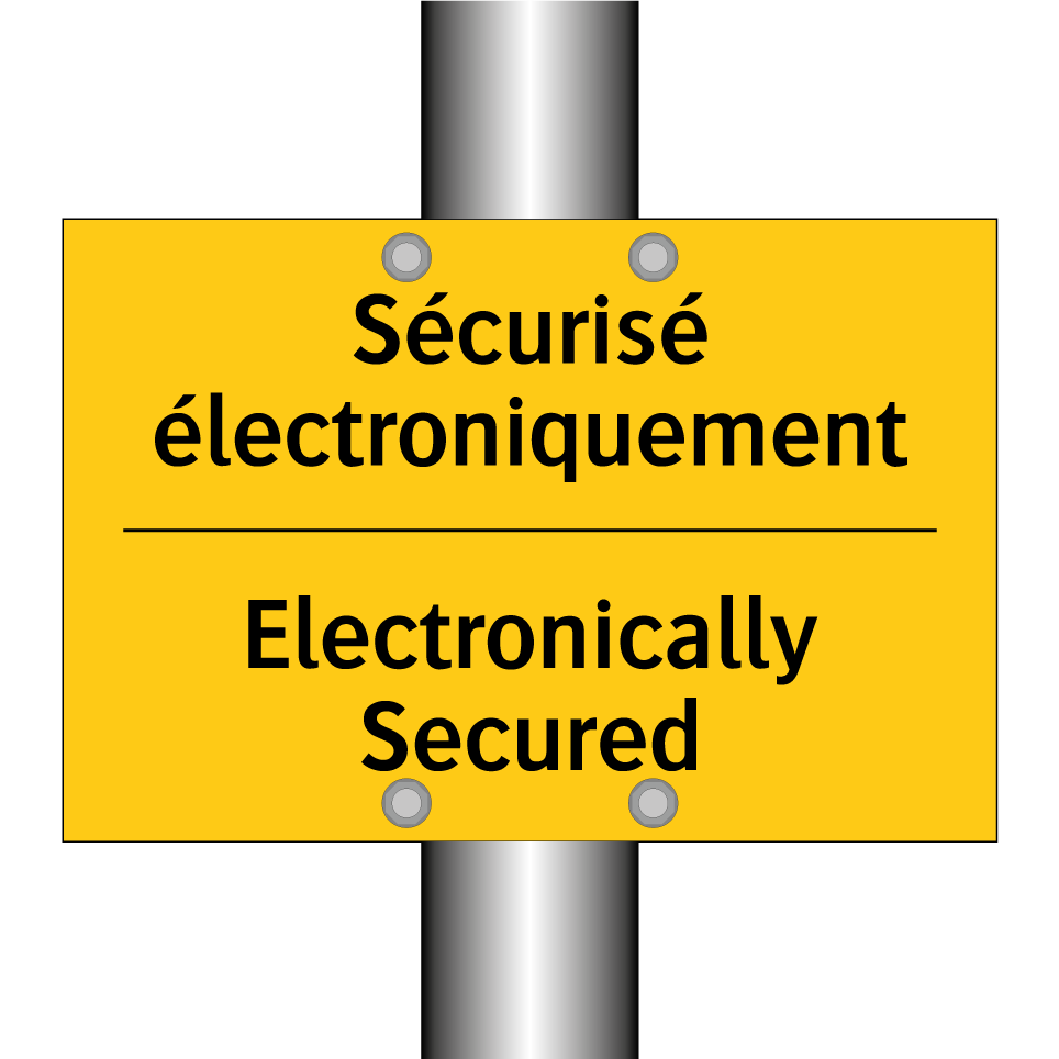 Panneau d'avertissement bilingue avec texte en français : "Sécurisé électroniquement", et en anglais : "Electronically Secured"