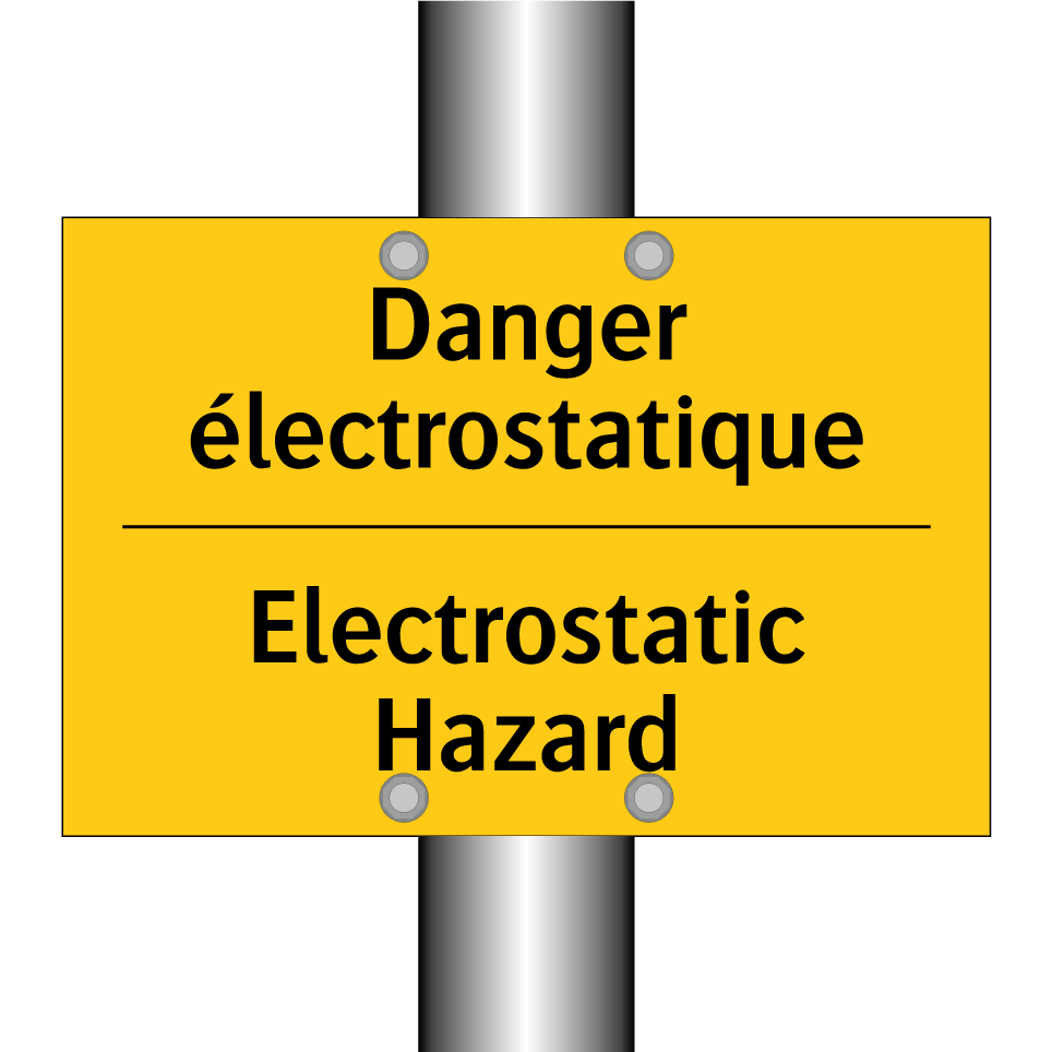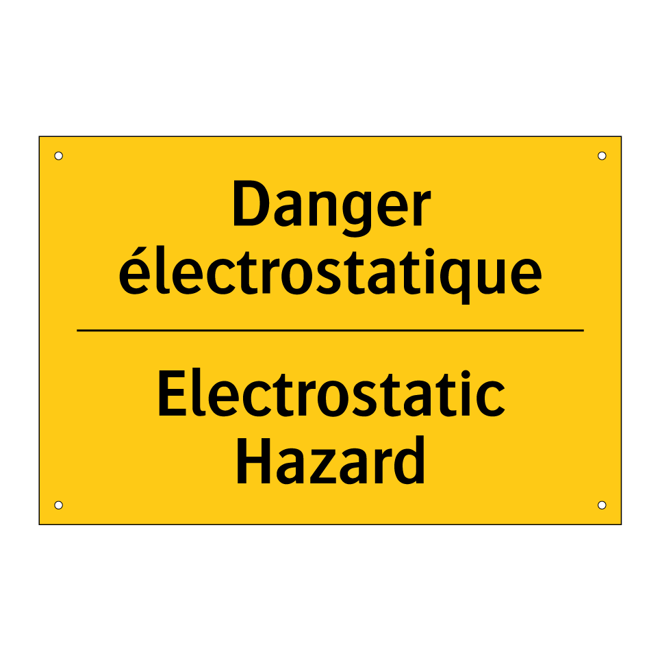 Panneau d'avertissement bilingue avec texte en français : "Danger électrostatique", et en anglais : "Electrostatic Hazard"