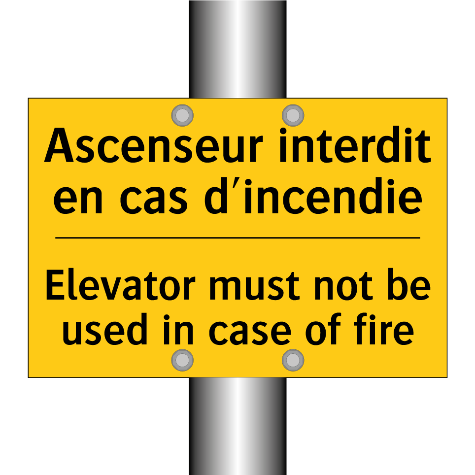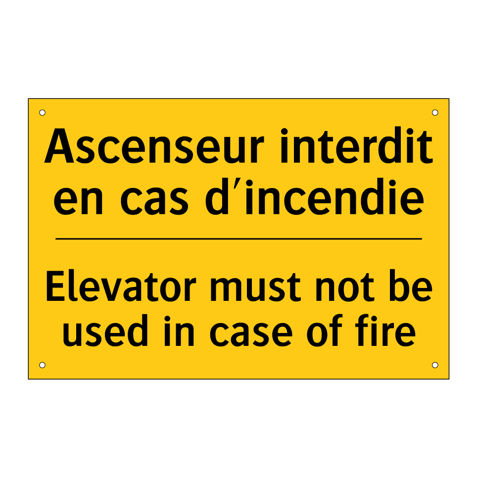 Panneau d'avertissement bilingue avec texte en français : "Ascenseur interdit en cas d'incendie", et en anglais : "Elevator must not be used in case of fire"