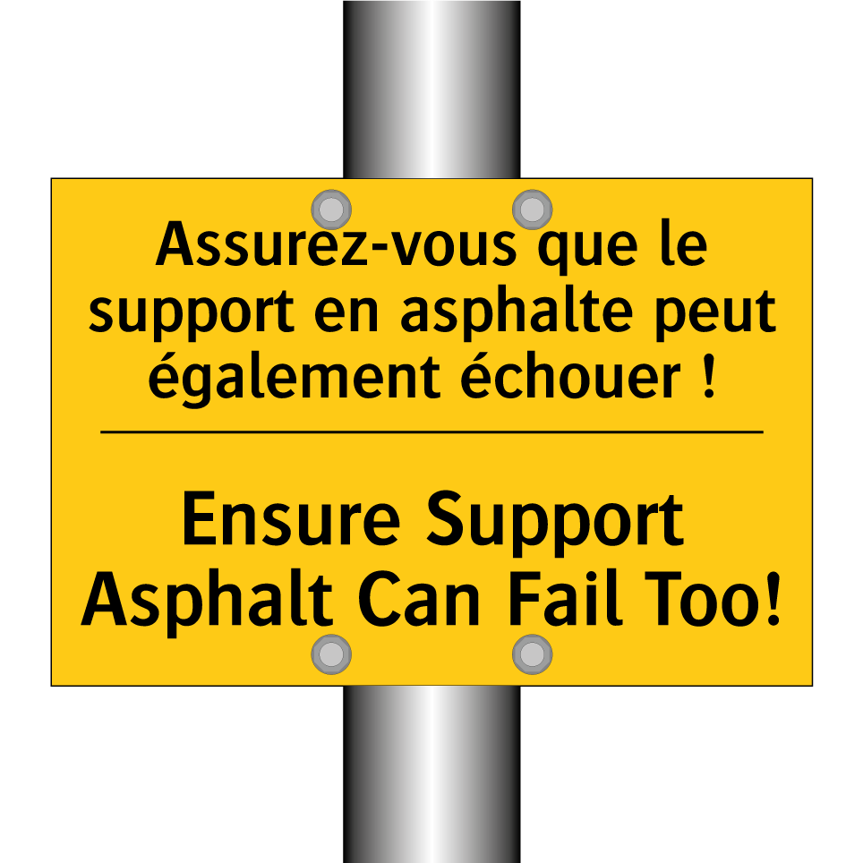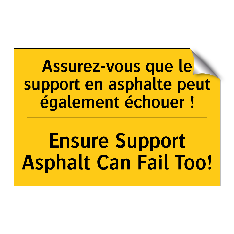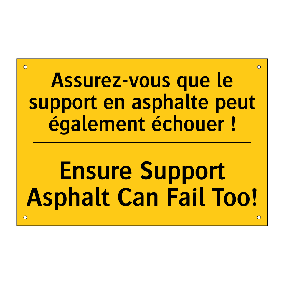 Panneau d'avertissement bilingue avec texte en français : "Assurez-vous que le support en asphalte peut également échouer !", et en anglais : "Ensure Support Asphalt Can Fail Too!"