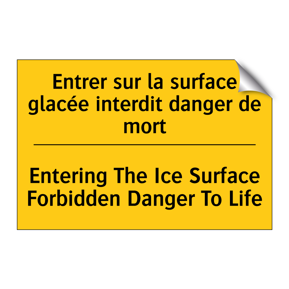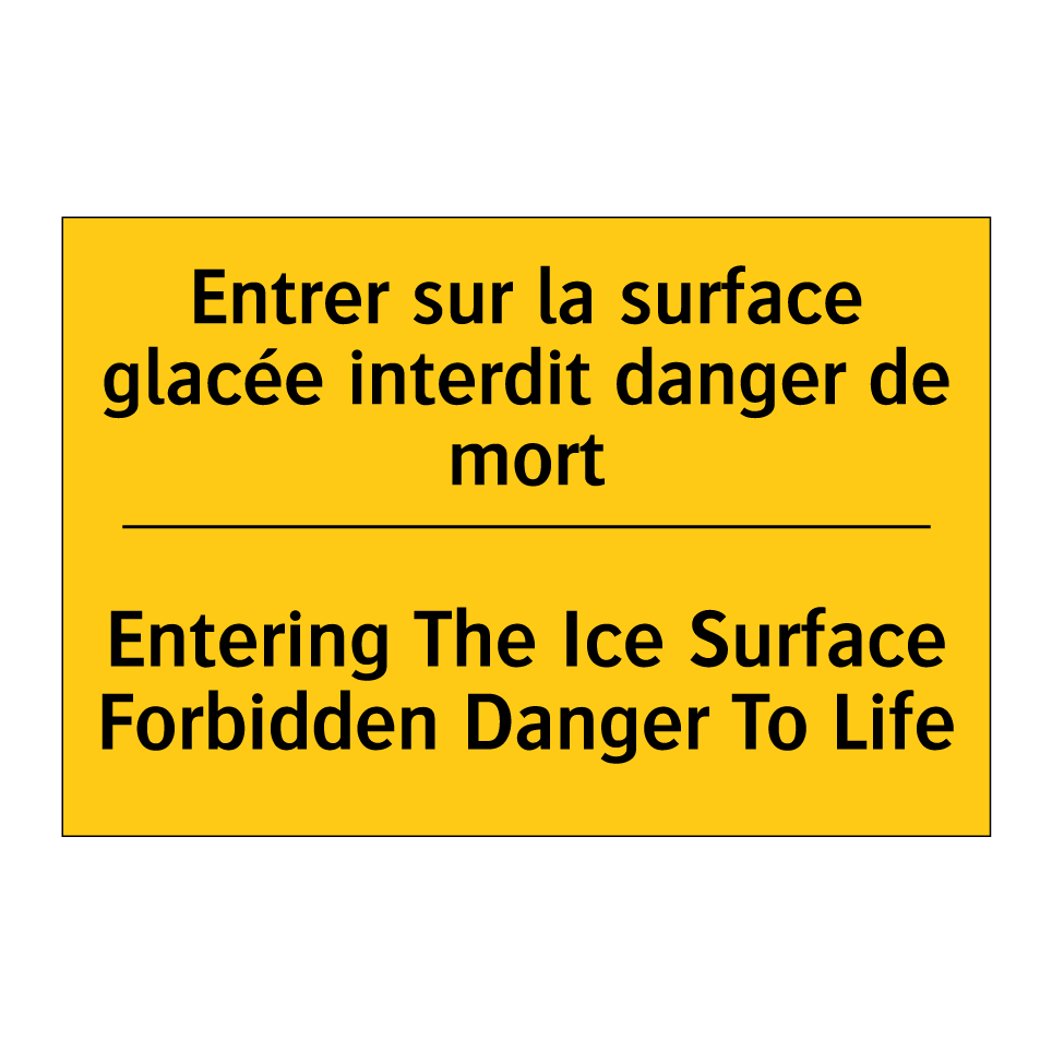 Panneau d'avertissement bilingue avec texte en français : "Entrer sur la surface glacée interdit danger de mort", et en anglais : "Entering The Ice Surface Forbidden Danger To Life"