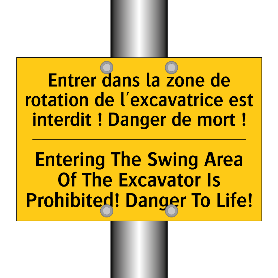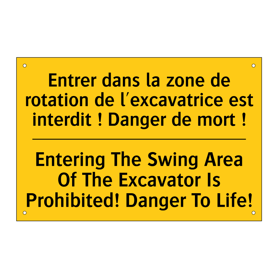 Panneau d'avertissement bilingue avec texte en français : "Entrer dans la zone de rotation de l'excavatrice est interdit ! Danger de mort !", et en anglais : "Entering The Swing Area Of The Excavator Is Prohibited! Danger To Life!"